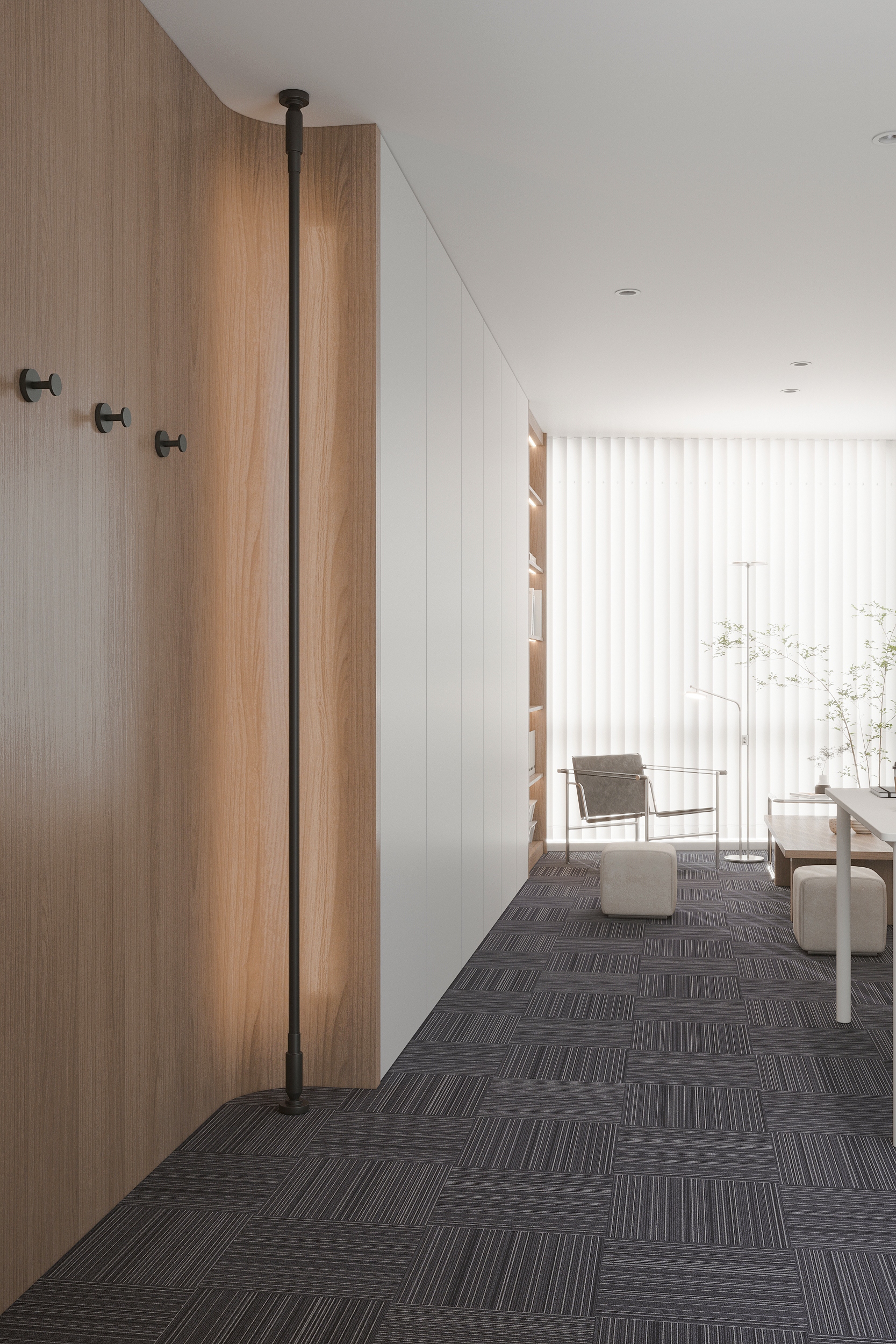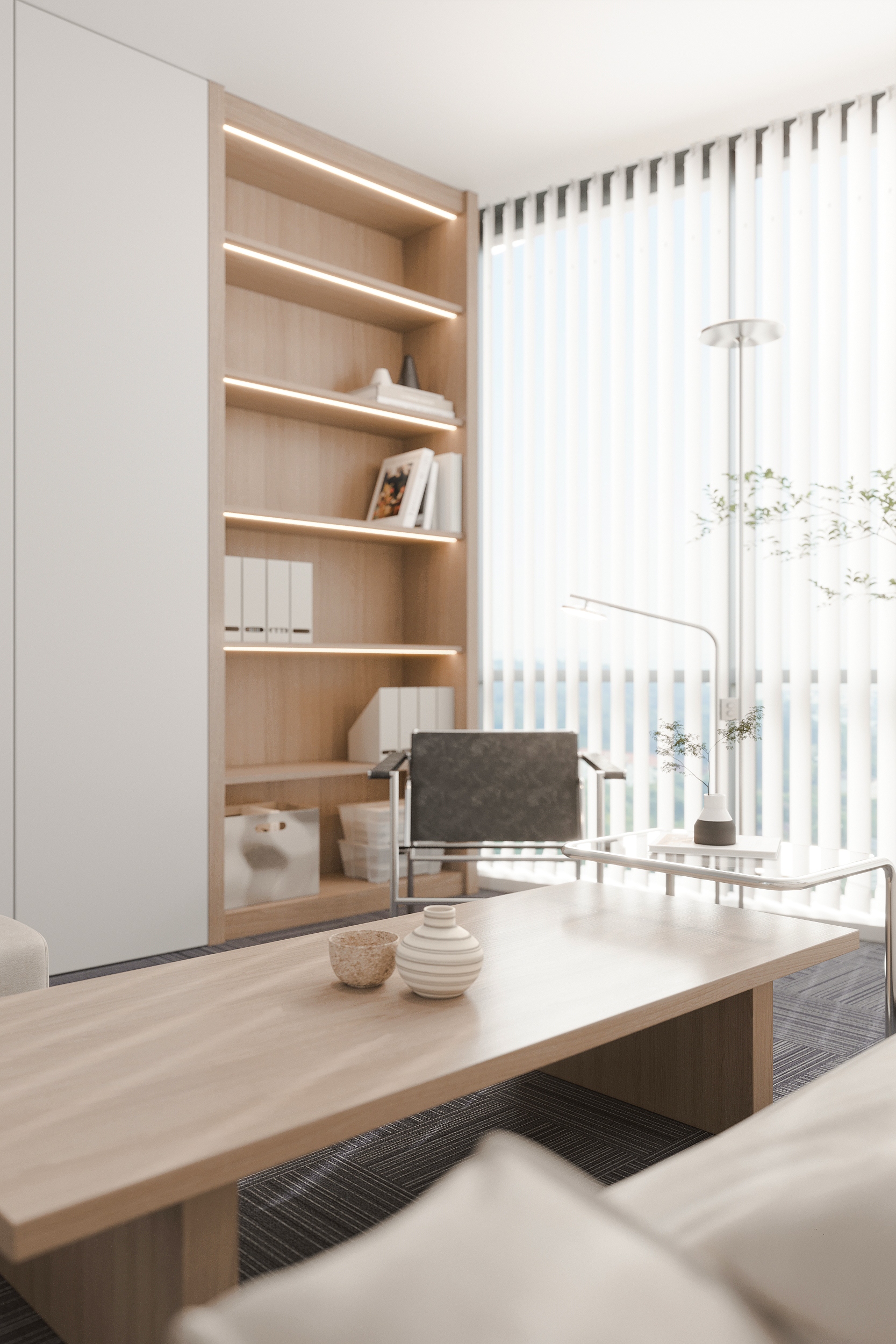 In this compact yet efficient space, special attention was given to the rational layout of office functions. The design team carefully selected sleek and functional office furniture to ensure that every inch of space is utilized effectively. To better meet the demands of daily work, several smart storage solutions were incorporated into the design, including wall-mounted bookshelves and concealed file cabinets, allowing for orderly storage of documents and office equipment. Every detail was meticulously designed to provide the lawyers with a high-efficiency, distraction-free working environment.The design of this law firm office is not merely a simple arrangement of a workspace but a profound understanding of the balance between work and life. In this 21-square-meter space, the wooden style and cozy furnishings complement each other, reflecting the two young lawyers' passion for their legal profession and their pursuit of quality living. It is hoped that in this blend of tranquility and vibrancy, everyone who steps inside will experience the harmonious fusion of wisdom and warmth.