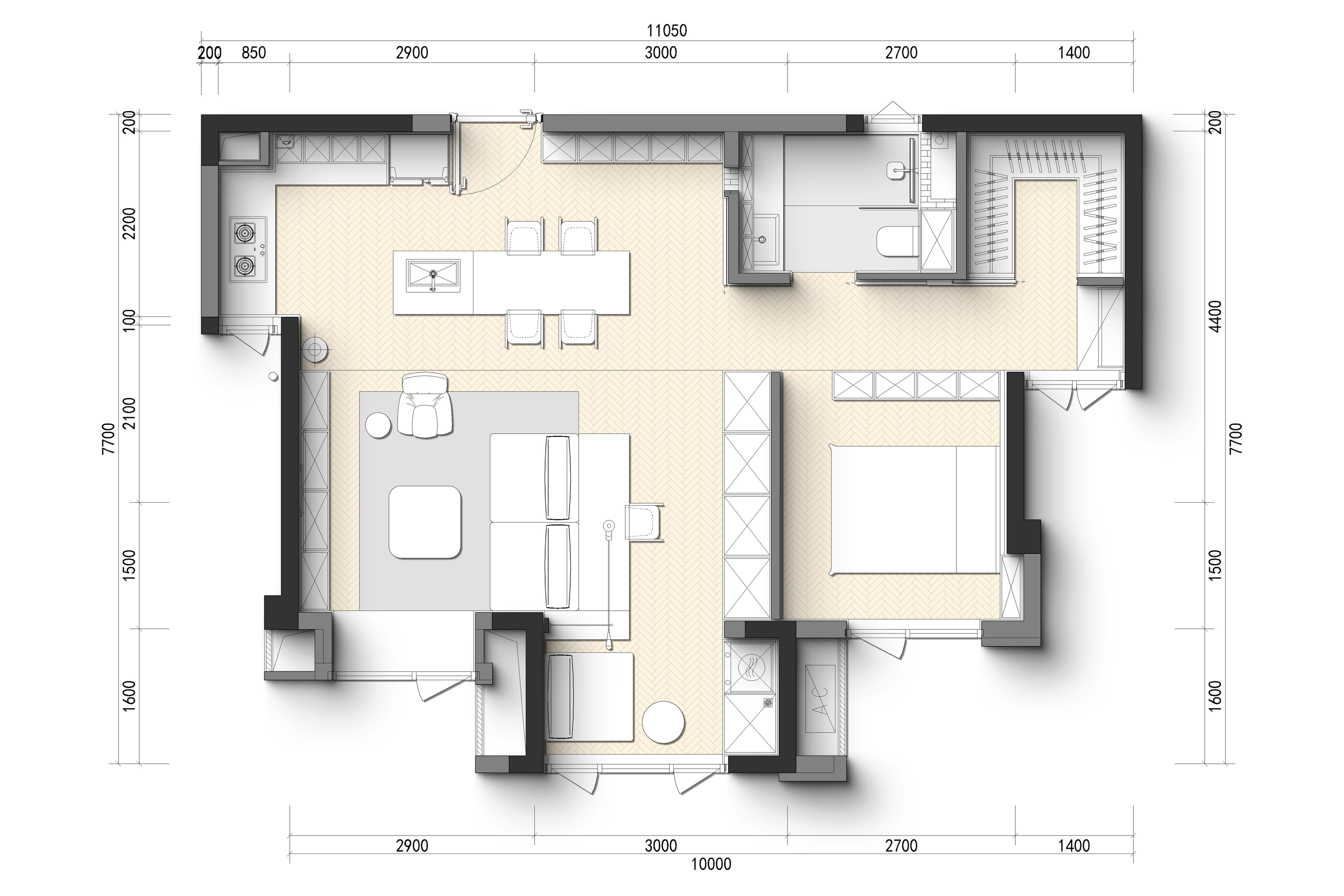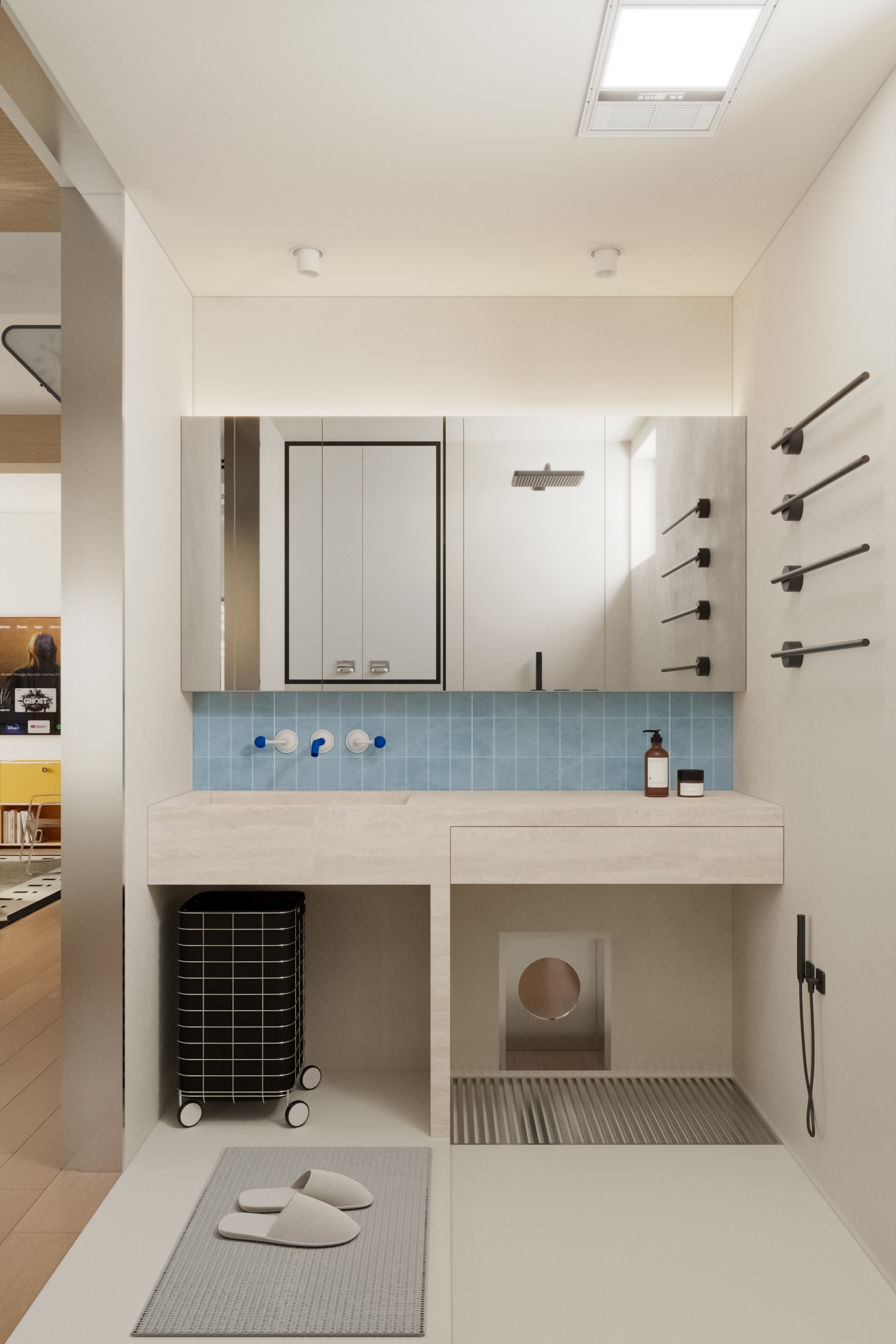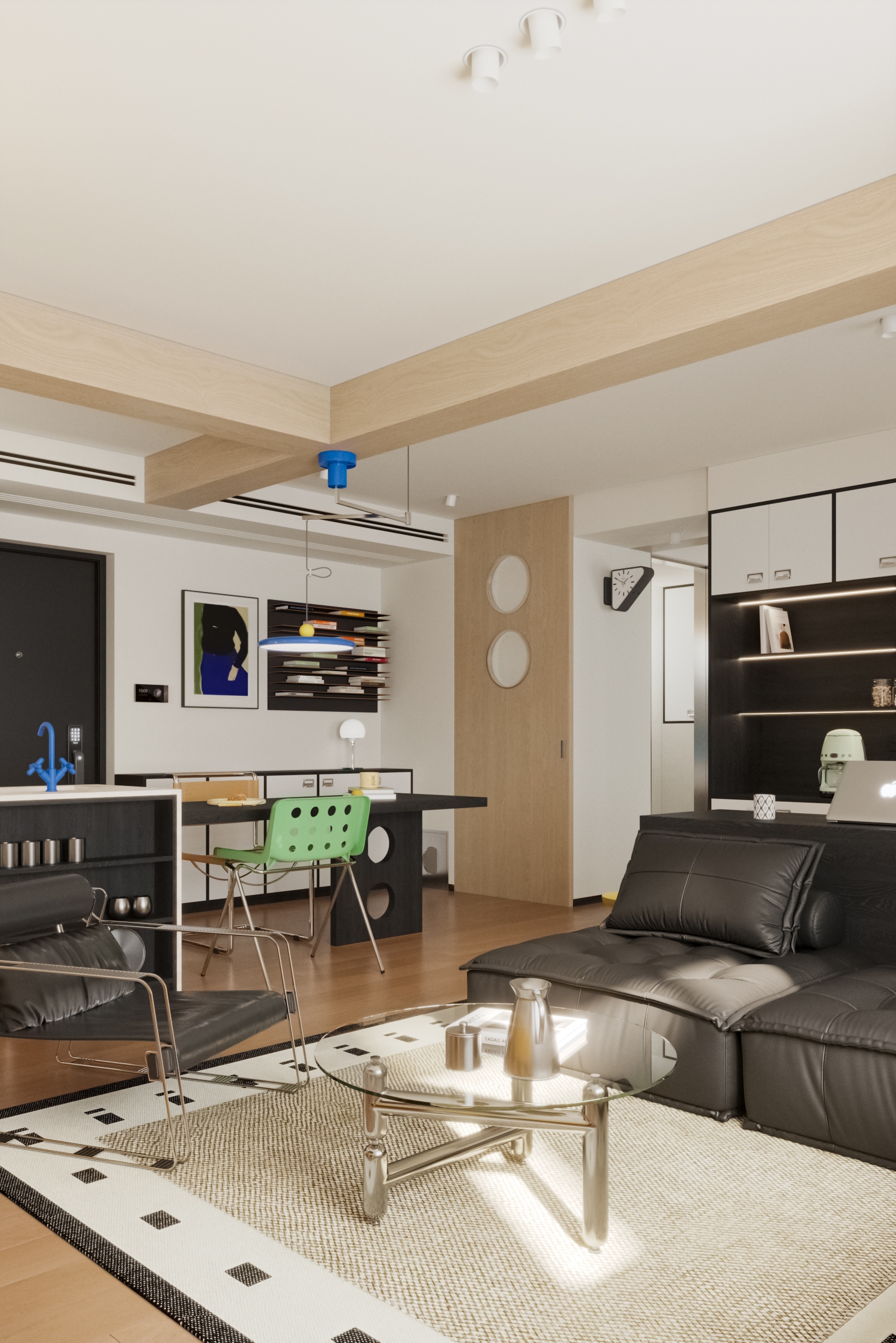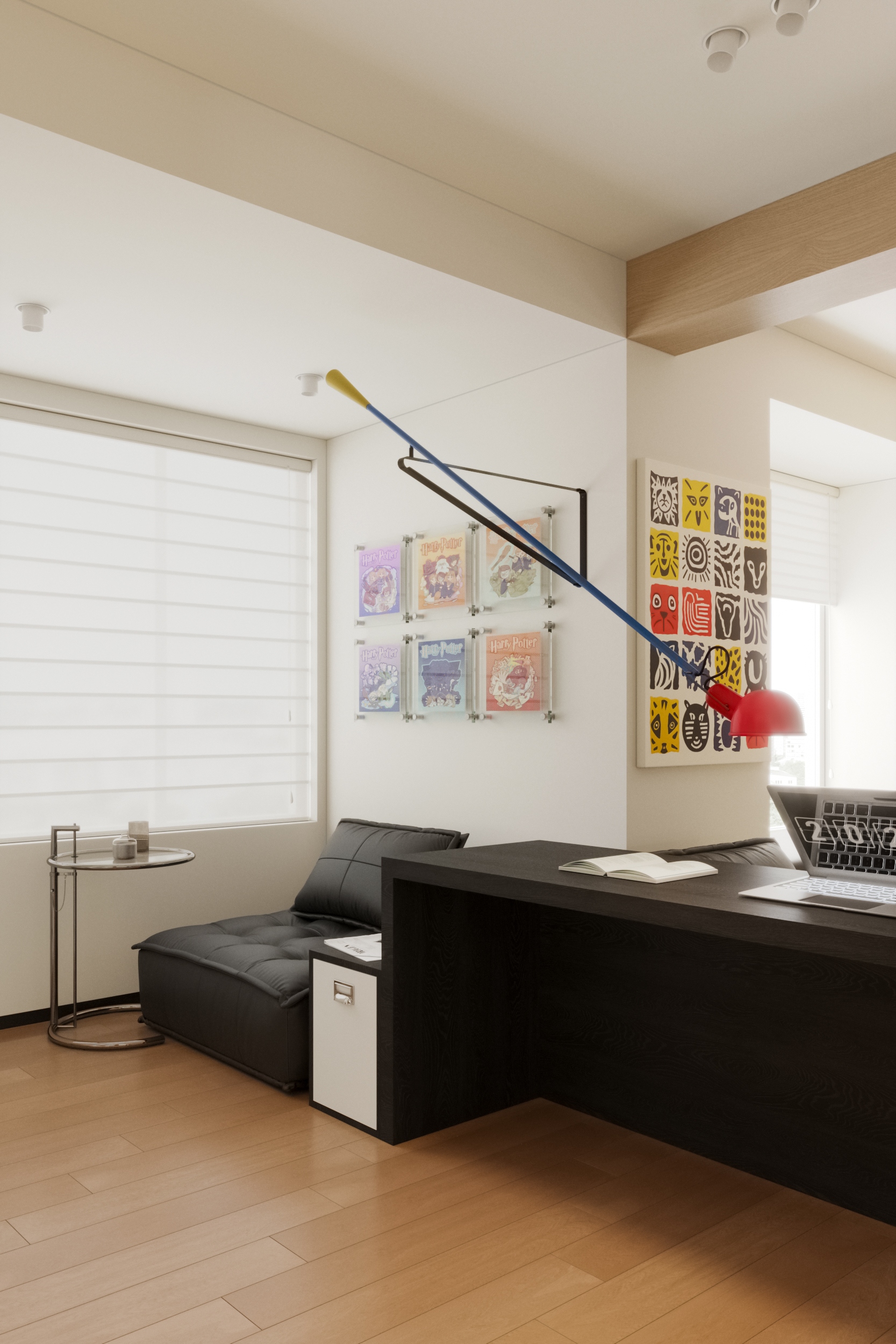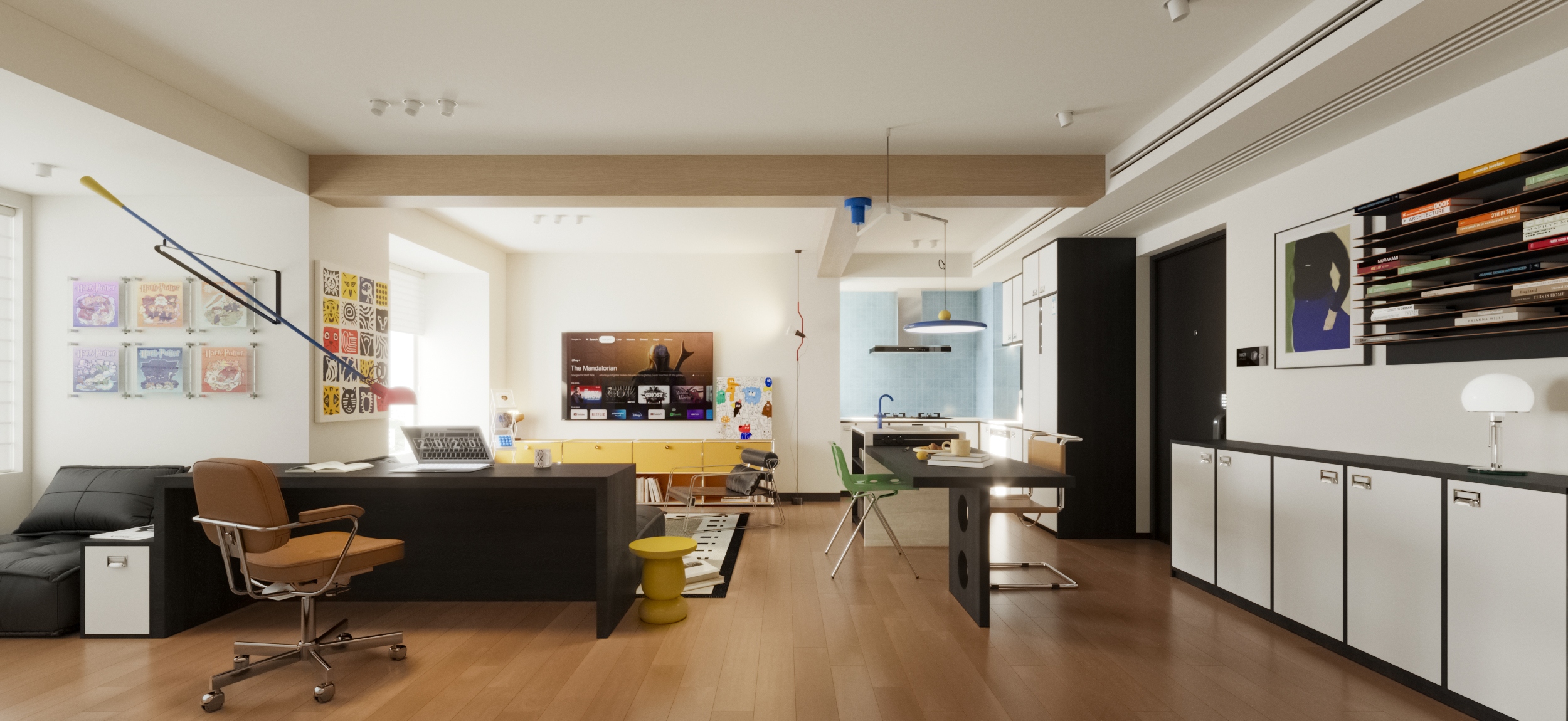 业主是一位年轻的教师,怀揣哈利波特式的奇想,向往旅途的斑斓与生活的松弛。64平方米的空间,以多巴胺配色为笔触,中古风骨为框架,包豪斯家具为韵脚,书写一场关于独居的诗意叙事。全开放式客餐厅,是自由折叠的剧场。模块化沙发如积木般灵动重组,从一人阅读到多人社交,场景随心境切换。纯白墙面与多巴胺色彩碰撞出青春的悸动。包豪斯的金属与深色木纹,以理性克制调和感性的张扬。原三居室的隔墙被打破,办公、餐厅与客厅区无缝衔接,独居的开阔空间被多元功能消解,只余下极致舒展的自洽。这方64㎡的岛屿,是霍格沃茨城堡的现代译本。多巴胺色彩挥洒着年轻的炽热,而包豪斯的理性线条,终将天马行空的幻想妥帖收容。当海沧的暮色漫入窗棂,独居者与乐高城堡共享寂静,或许会听见空间在低语:生活本身就是最伟大的魔法。