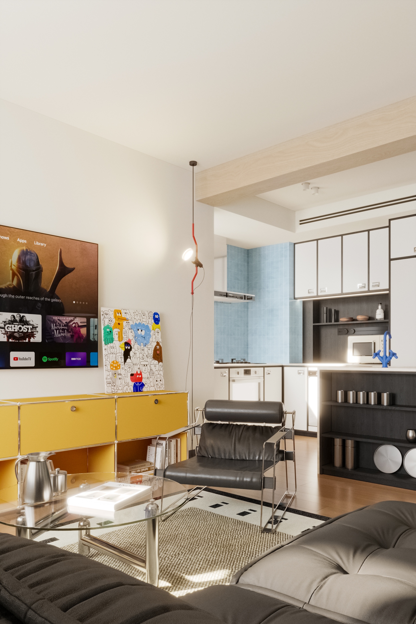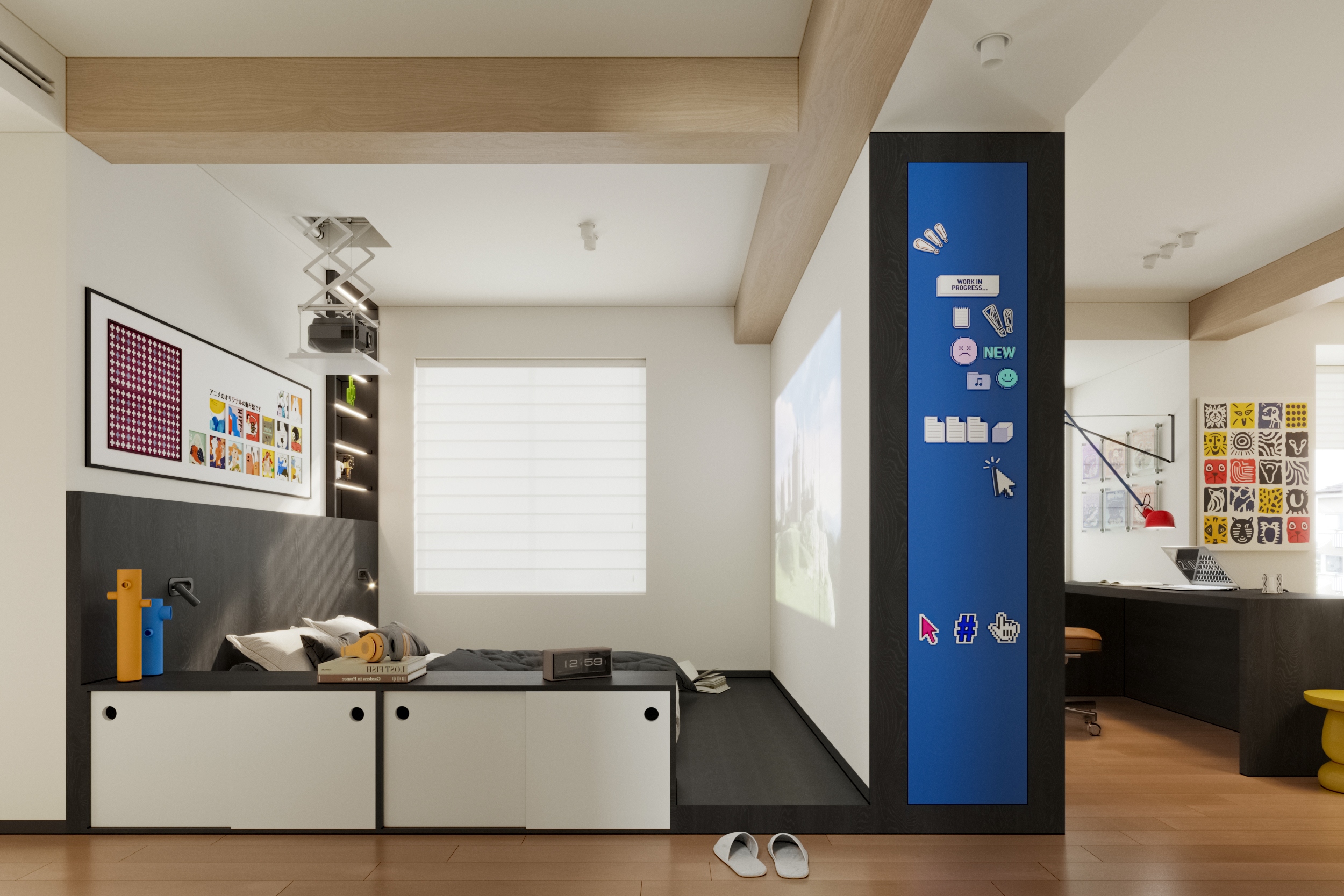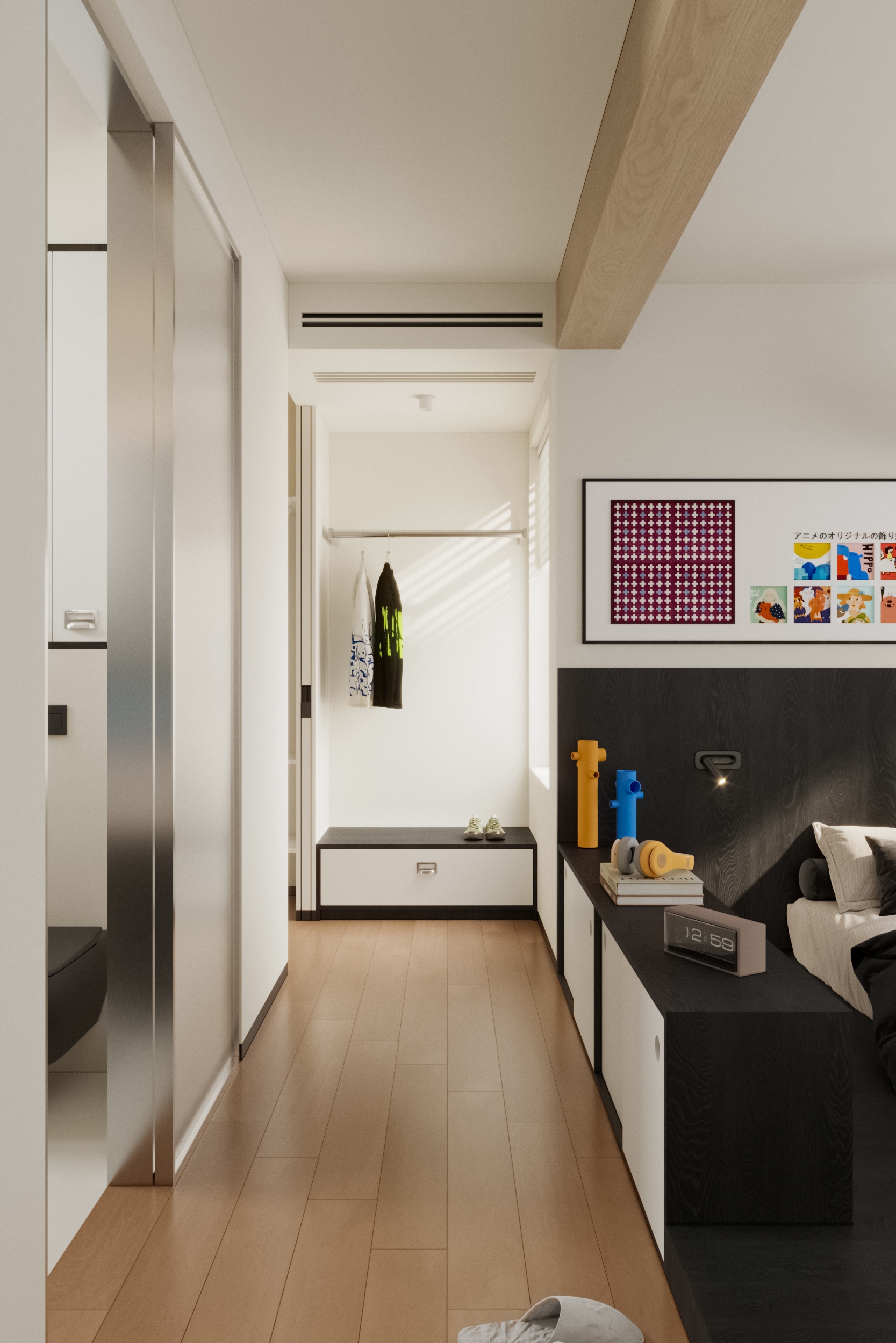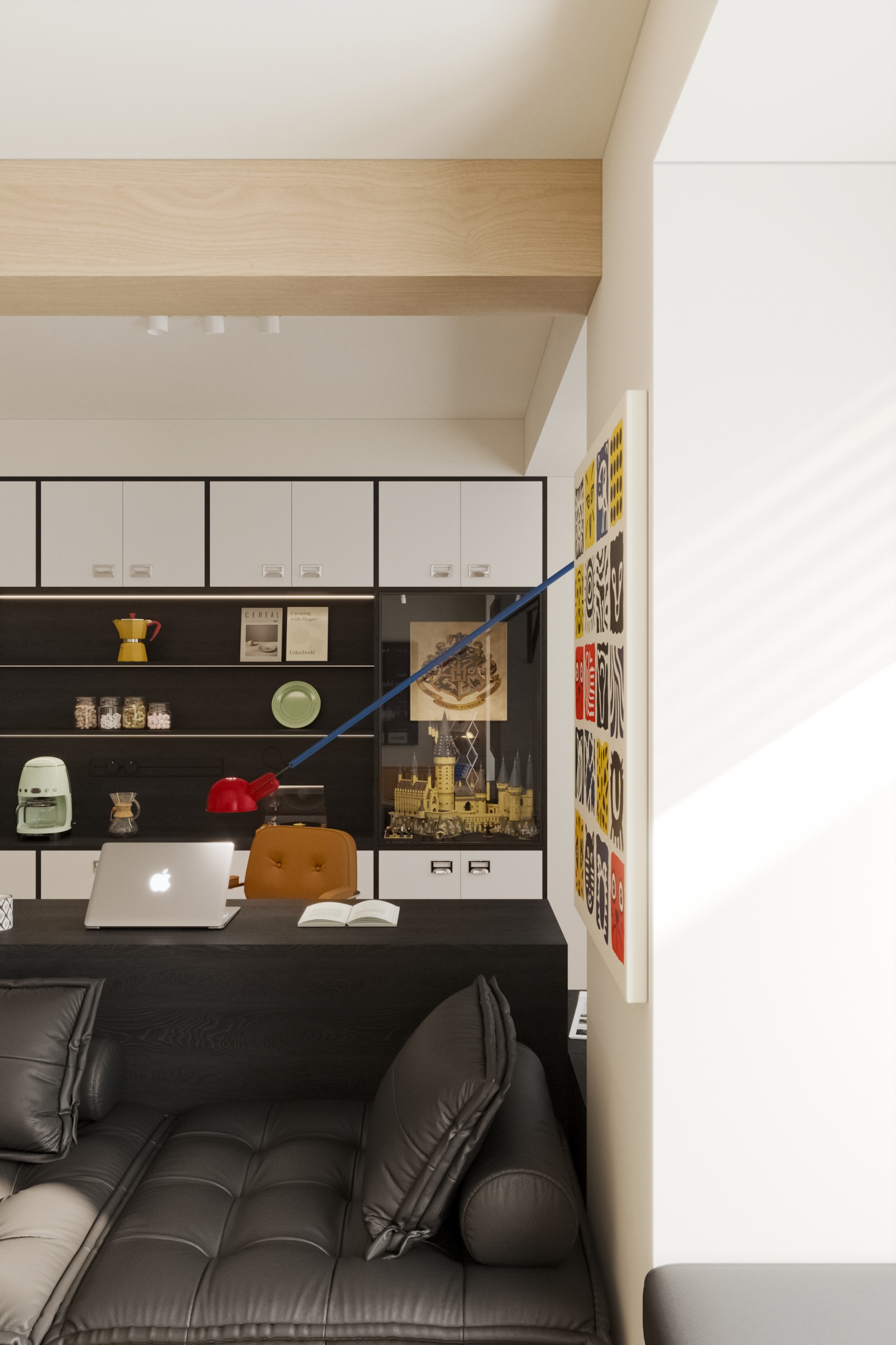 The homeowner, a young teacher with Harry Potter-esque whimsy, yearns for the kaleidoscope of journeys and the unhurried rhythm of life. Within this 64-square-meter space, a dopamine-infused palette dances across mid-century modern bones, punctuated by Bauhaus furnishings, composing a poetic ode to solo living.The fully open-plan living-dining area unfolds as a theater of fluid transformations. Modular sofas, like building blocks, morph effortlessly from solitary reading nooks to social hubs. Pristine white walls clash joyously with dopamine-driven hues, sparking youthful vitality, while Bauhaus metals and dark wood grains temper exuberance with rational restraint. By dismantling walls of the original three-bedroom layout, work, dining, and living zones merge seamlessly. What remains is not mere emptiness, but a self-contained universe where multifunctionality dissolves spatial boundaries, leaving only pure, unfettered harmony.This 64-square-meter island reimagines Hogwarts for the modern age: dopamine hues blaze with youthful fervor, while Bauhaus lines anchor flights of fancy. As twilight seeps through Haicang’s windows, the dweller and Lego castle share a silence where space itself whispers:Life is the greatest magic of all.