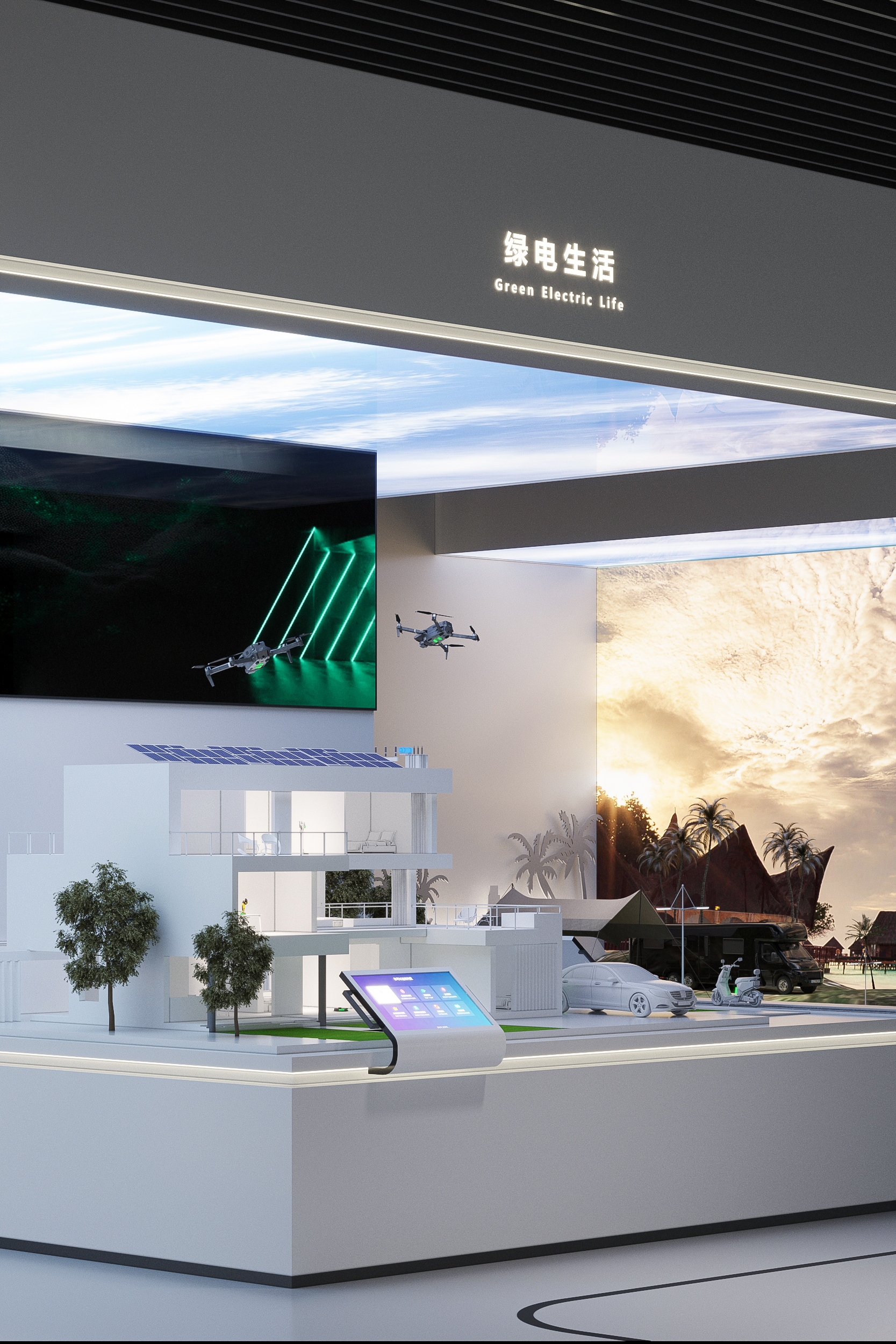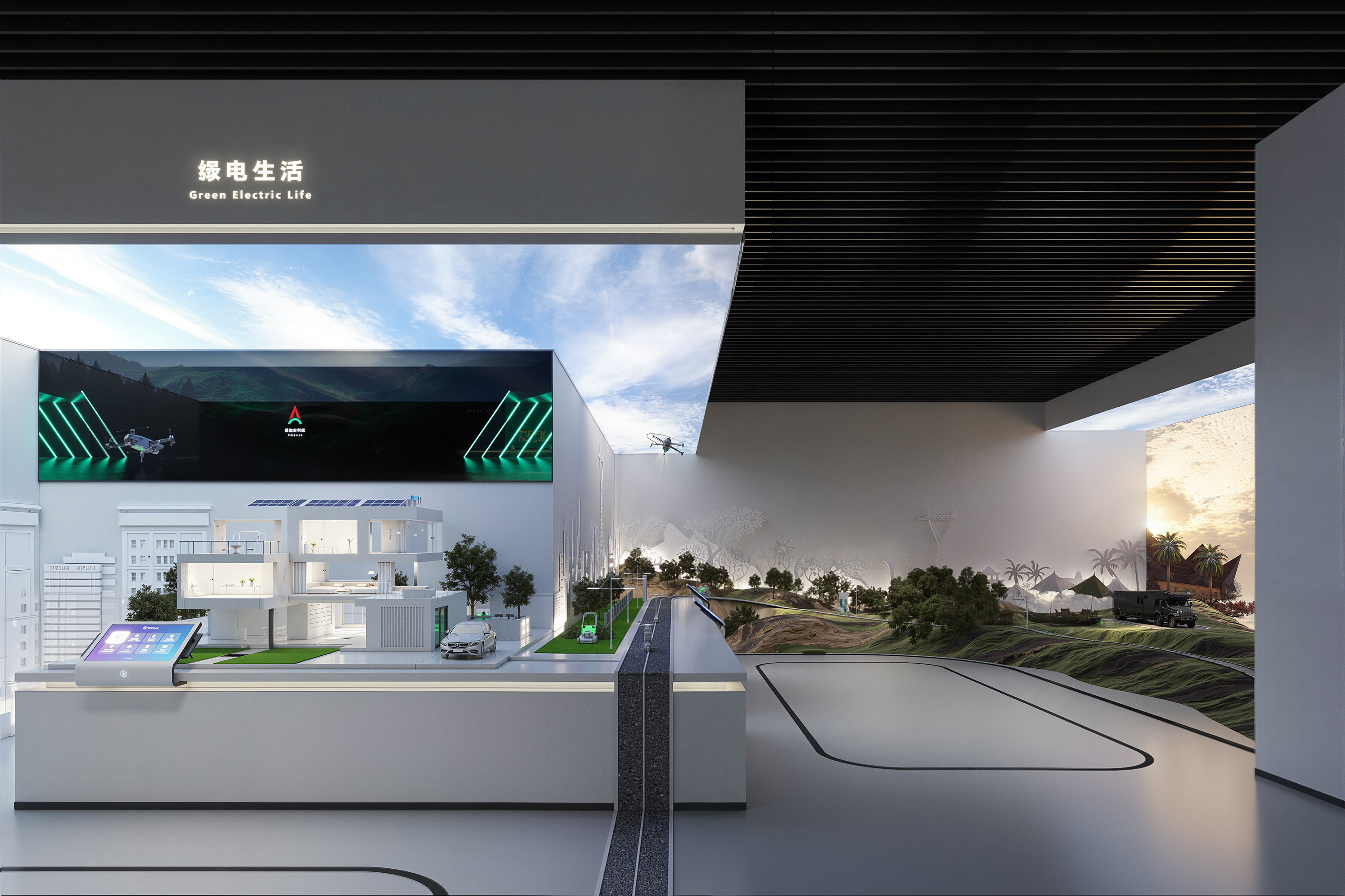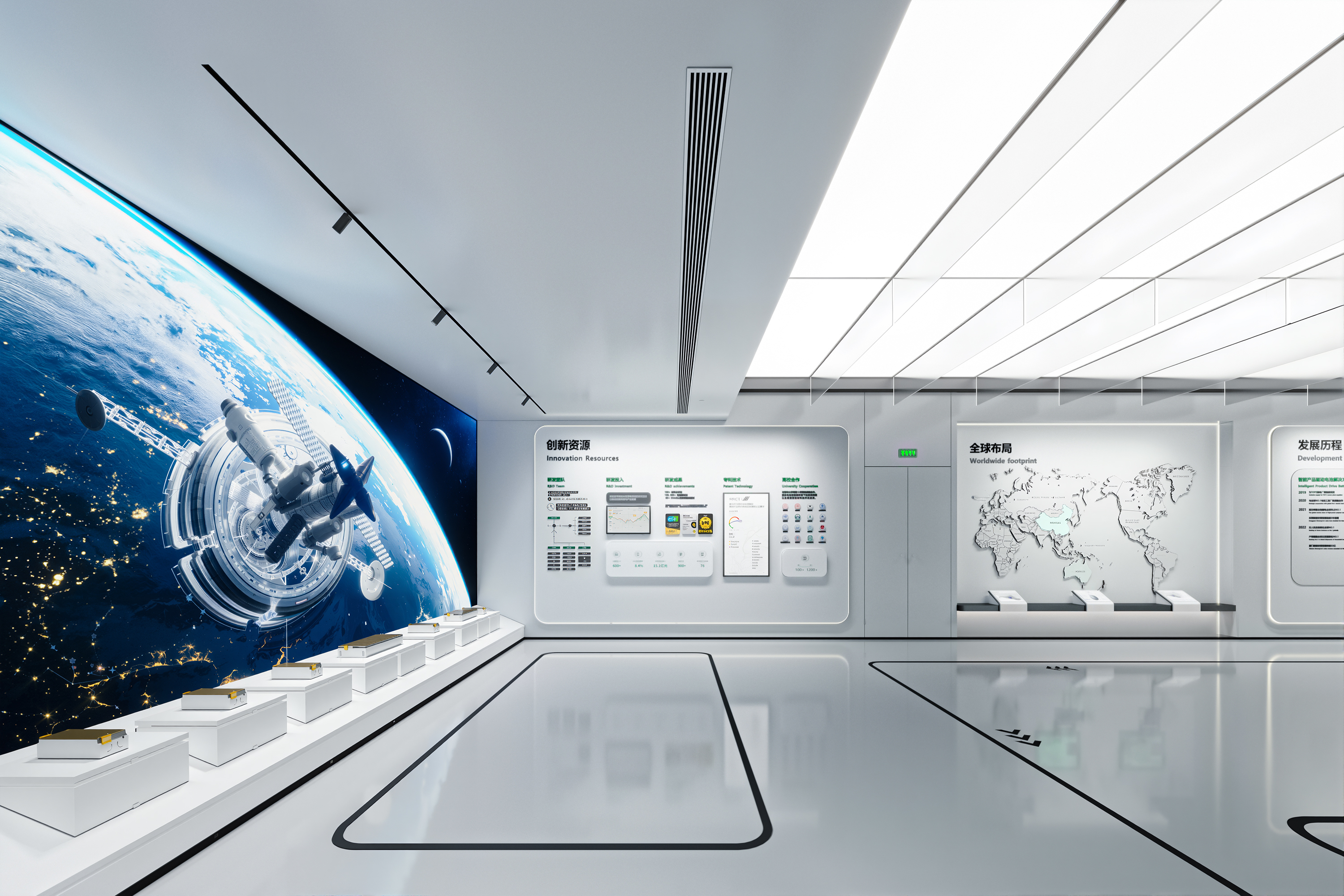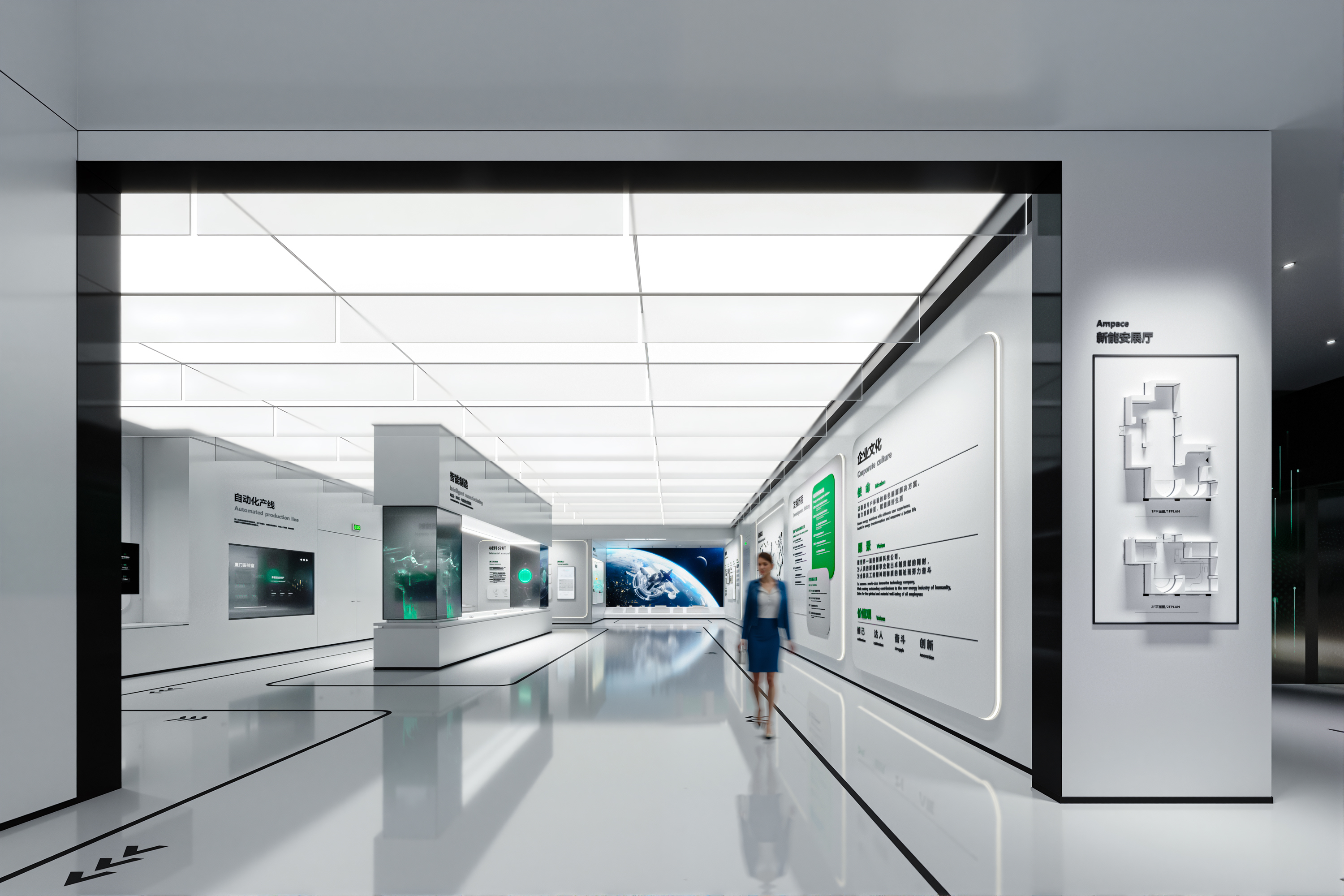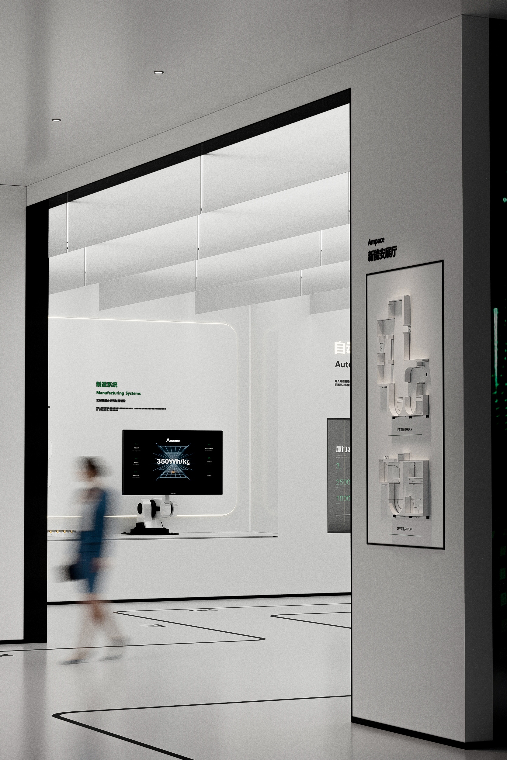 As a joint venture between the globally renowned lithium battery suppliers ATL and CATL, Ampace focuses on the research and innovation of high-end lithium batteries. It specializes in the development, production, sales, and service of energy storage systems, micro vehicles, and batteries for smart products. By providing green energy solutions that deliver exceptional user experiences, it contributes to energy transformation and empowers a better life.The core of this exhibition hall design project is the creation of a "full-scenario green energy ecosystem." The hall is spread across two floors, covering a total area of 770 square meters. It primarily showcases Ampace technological innovations and development history in the green energy sector. The design not only serves the needs of brand promotion, strength demonstration, and business collaboration but also, through a fresh exhibition concept, creates a platform that inspires deep reflection and fosters dialogue and cooperation.