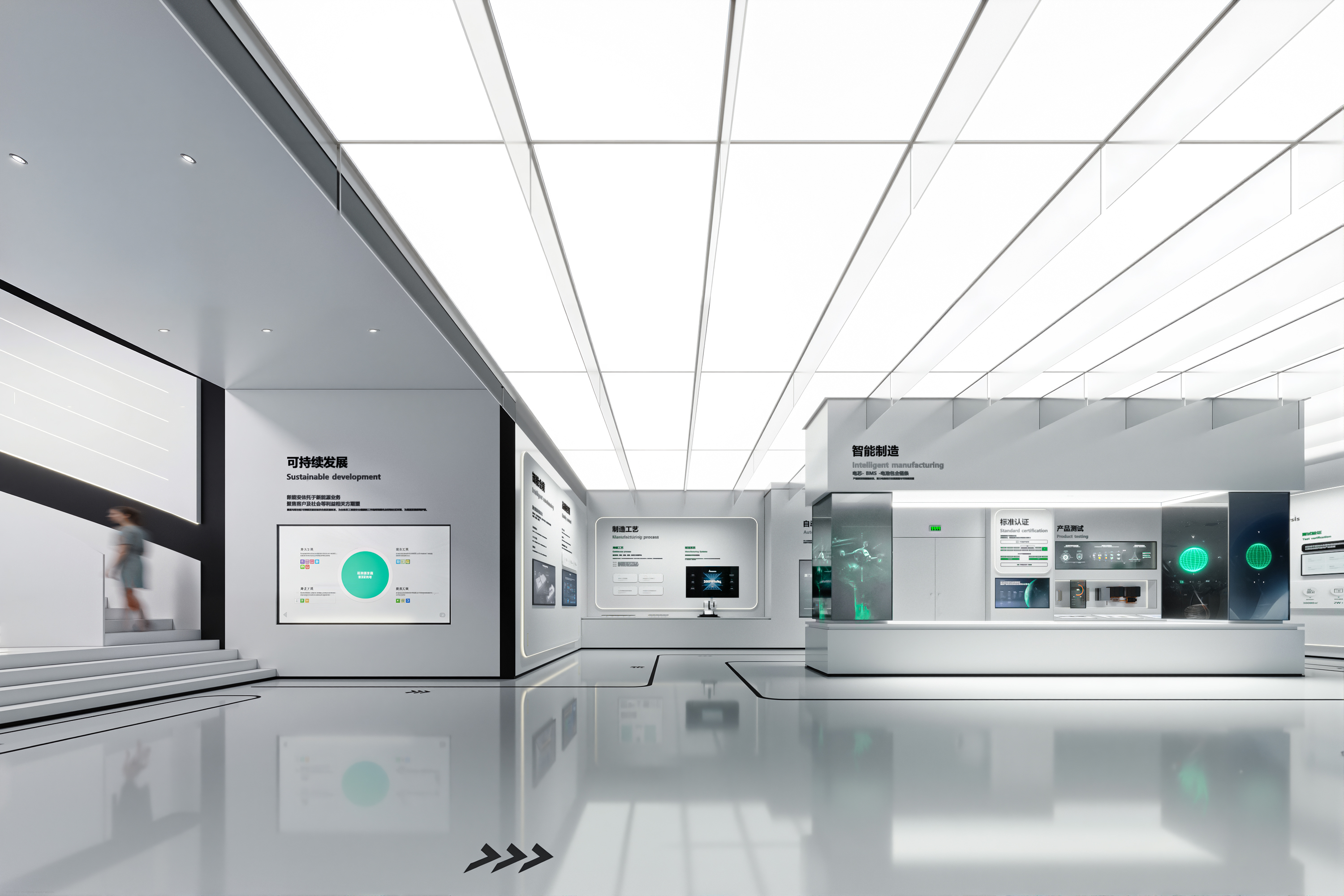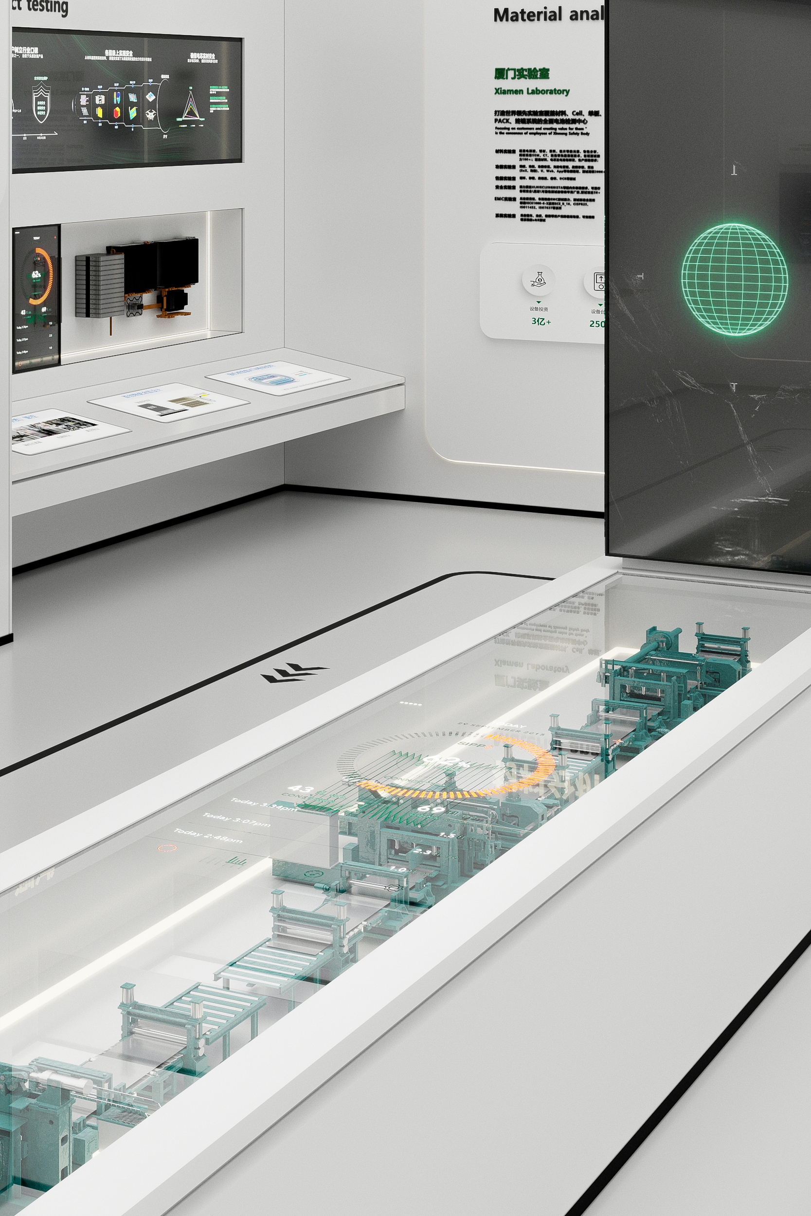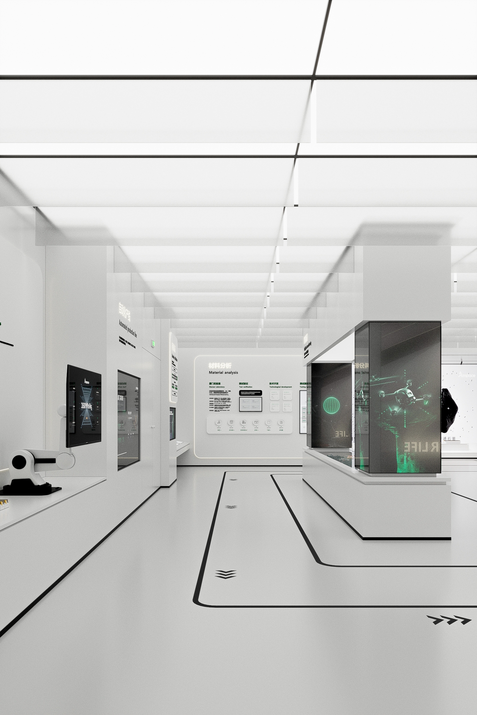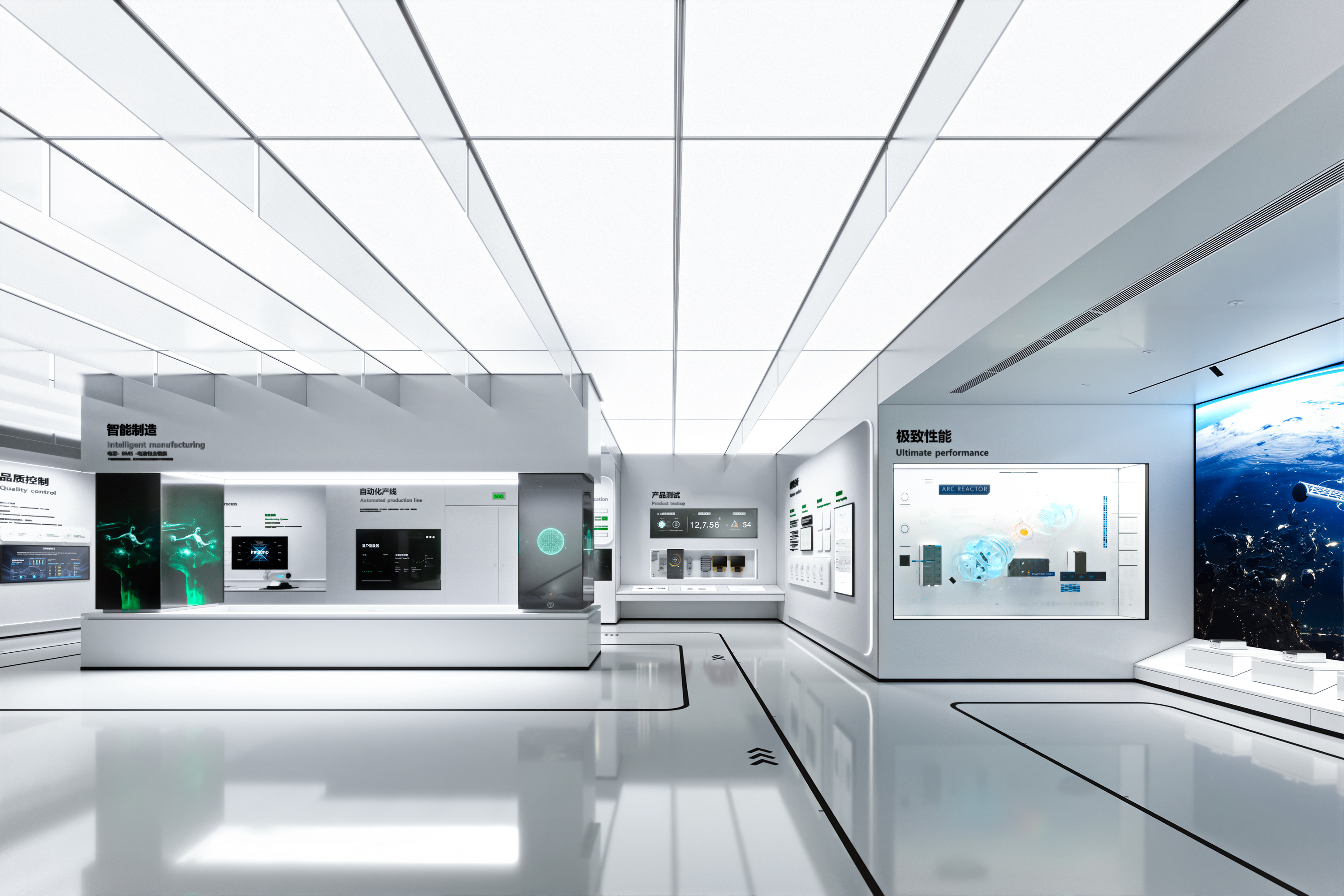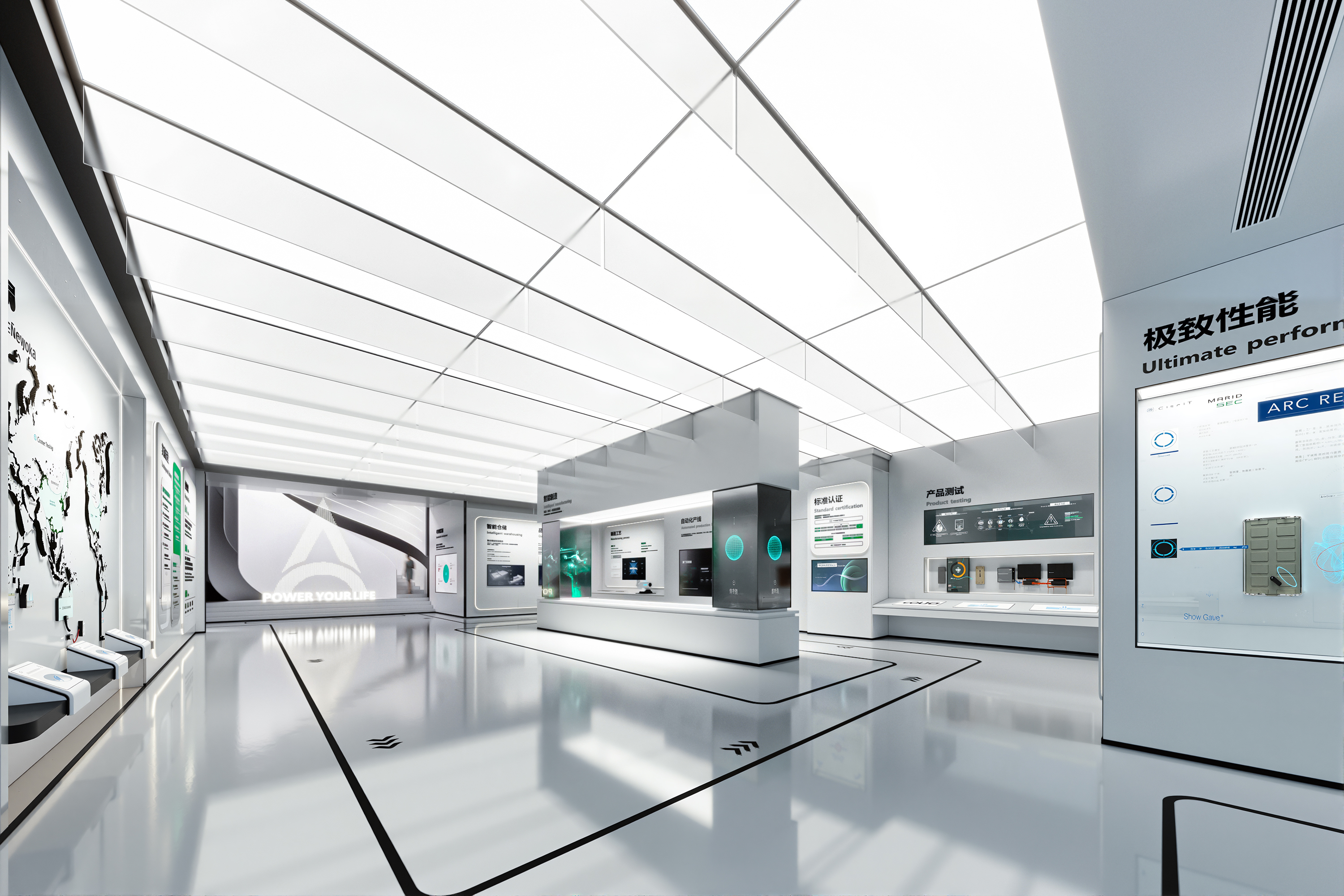 作为全球知名锂电池供应商——ATL与CATL的合资公司,新能安专注高端锂电池的研究与创新,聚焦储能系统、微型车、智能产品驱动电池等三大领域的研发、生产、销售与服务。以极致用户体验的绿色能源解决方案,助力能源转型,赋能美好生活。本次展厅设计项目的核心是“全场景绿电生态圈”的构建。展厅分为两层,总面积770平方米,以展示新能安在绿色能源领域的技术创新与发展历程为主线,设计不仅服务于品牌推广、实力展示和商务合作的需求,更通过全新的展陈理念,塑造了一个能够引发深刻思考、激发对话与合作的平台。