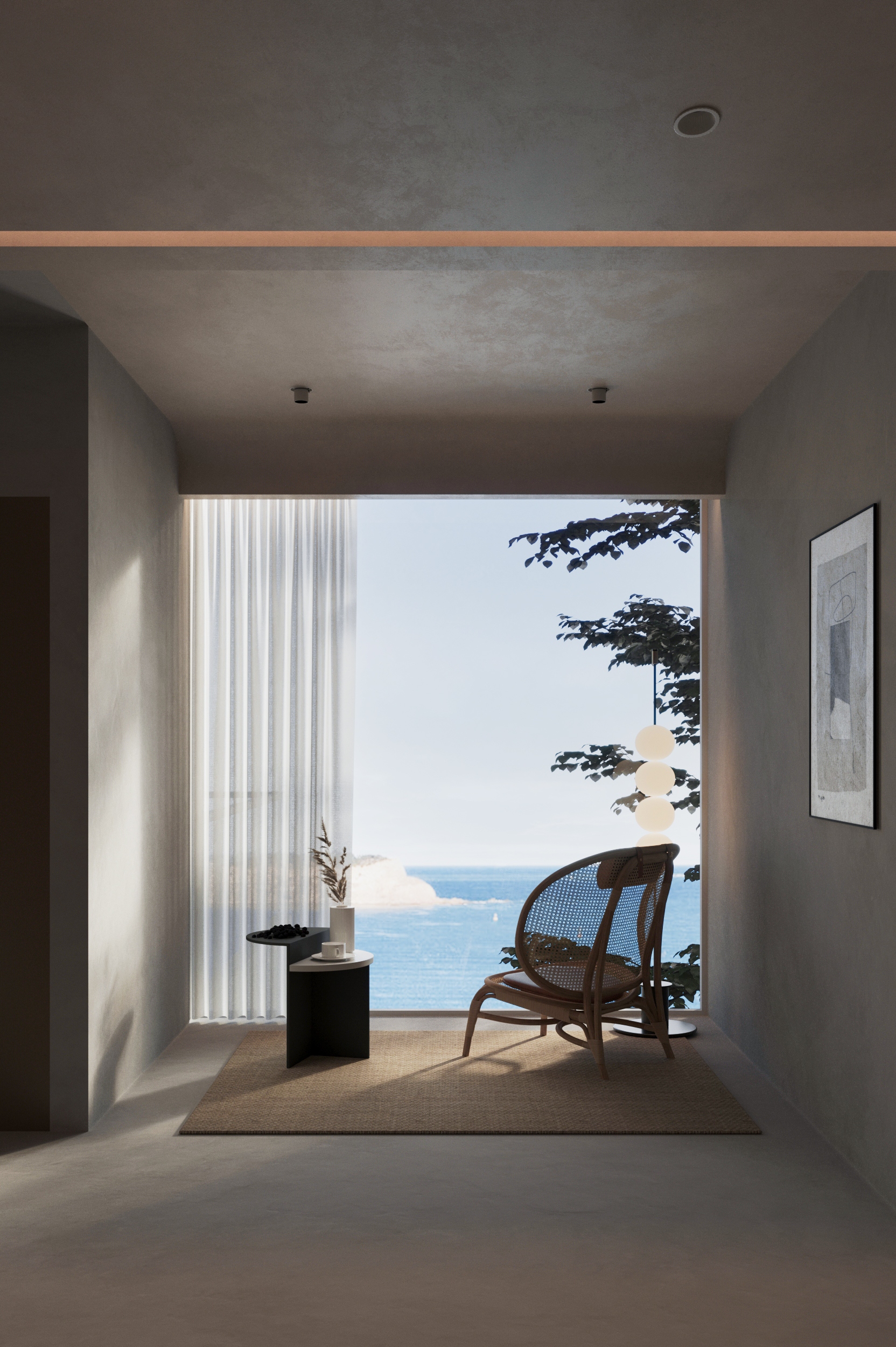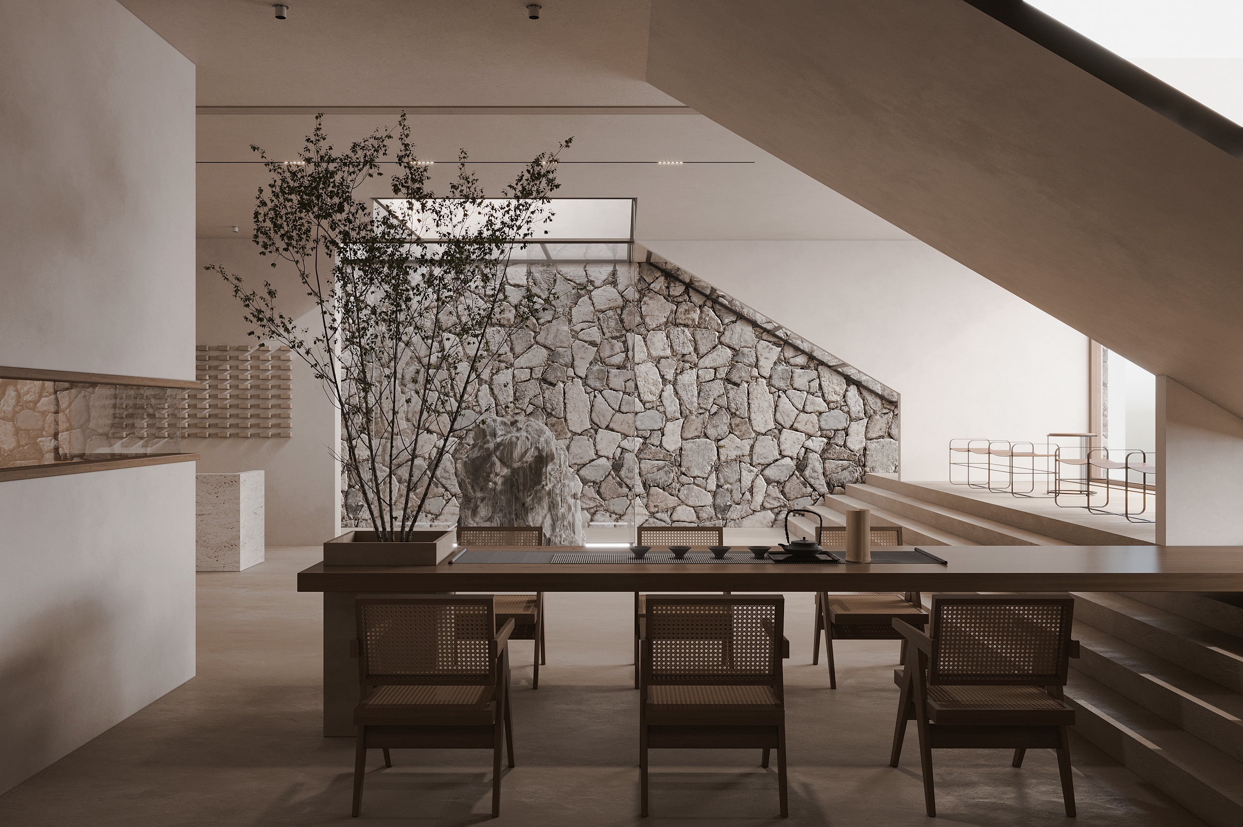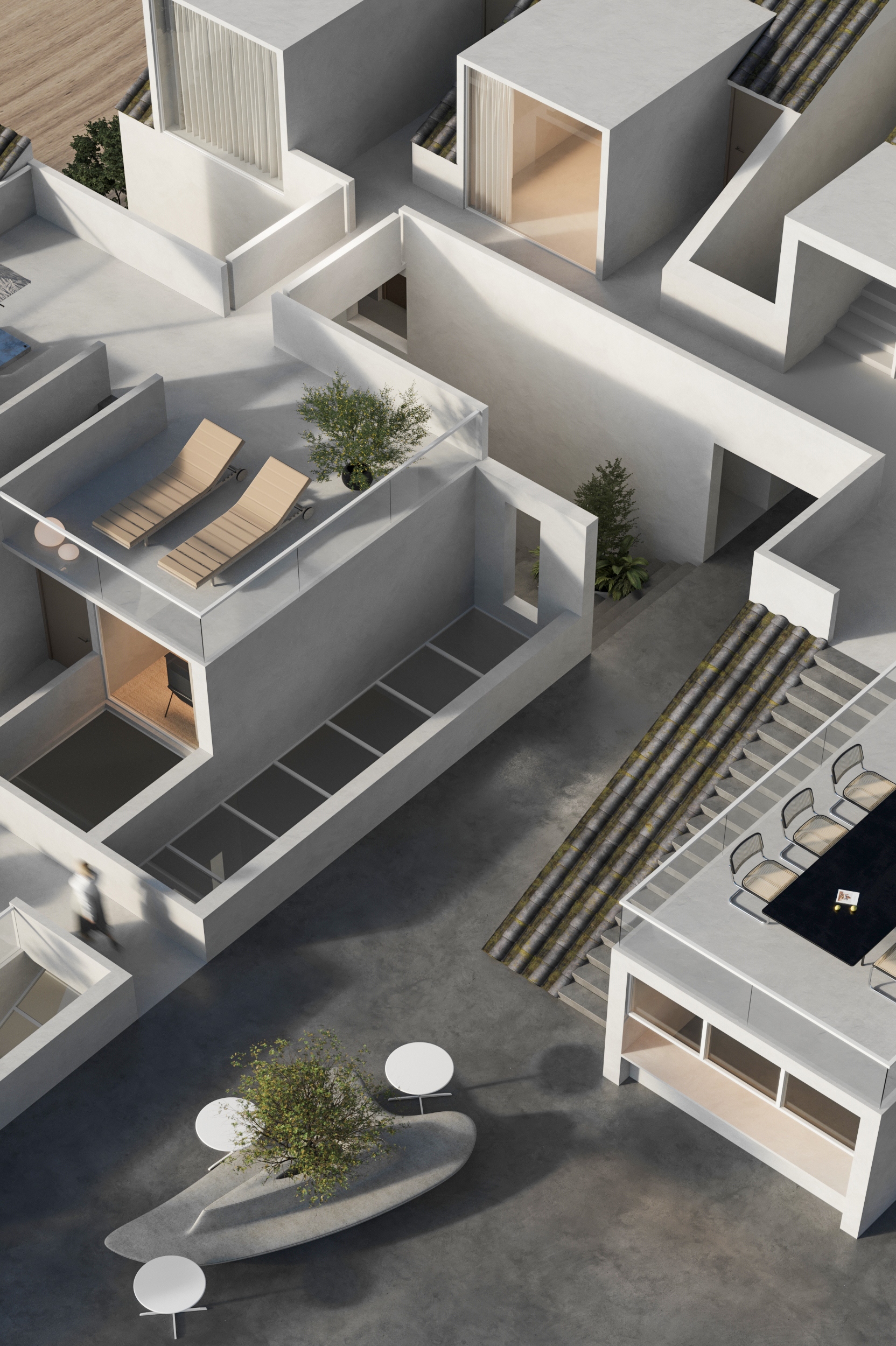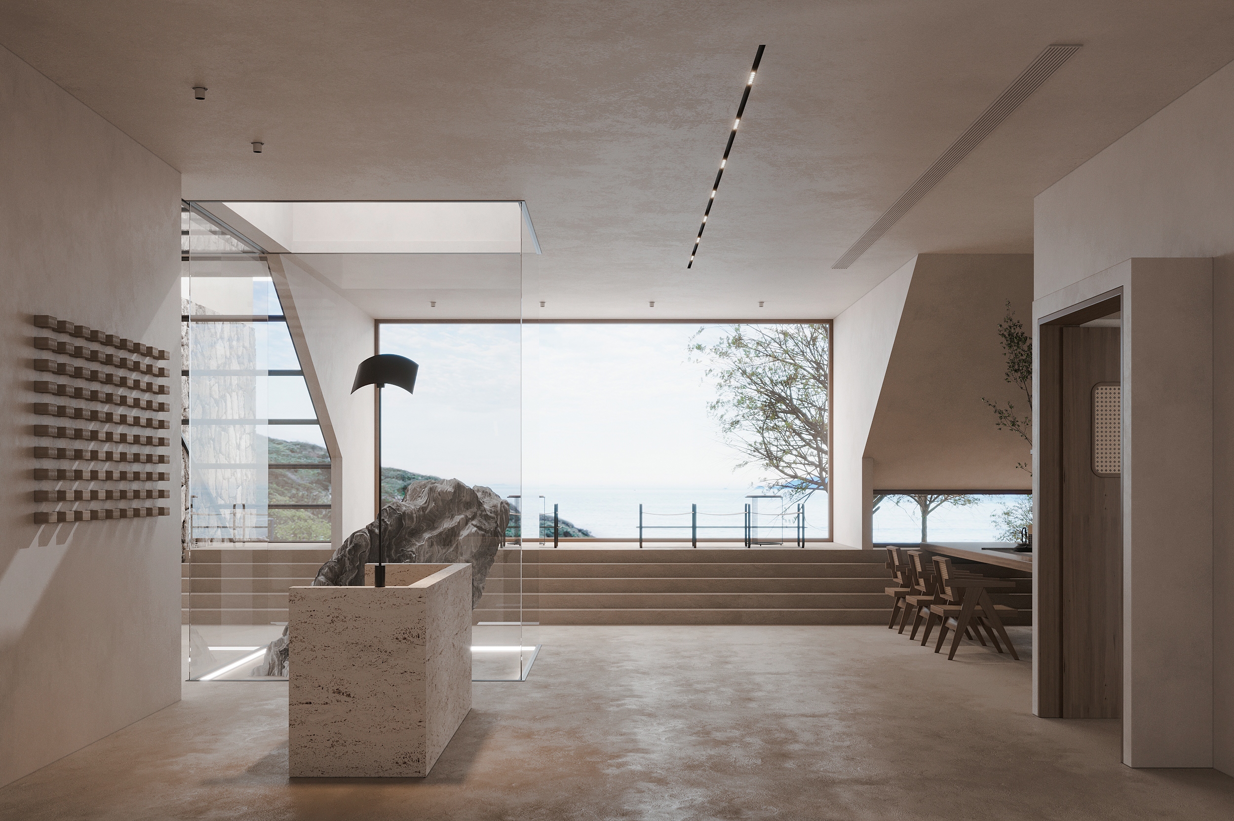 “向海而生”,是嵊泗岛民千年血脉里的生存智慧,亦是本项目临海而立的灵魂宣言。面对依山就势、错落有致的原有建筑群与壮阔海景间的天然高差,我们以“顺势”为设计圭臬。改造并非强加,而是精心梳理,让建筑群如浪涌般自然转向,迎向海洋的怀抱,为民宿集群编织出无遮挡的极致观景视野。这不仅是对海岛人文脉络的虔诚致敬,更是对项目未来商业价值的深度唤醒。 设计谦逊地顺应着村庄的原始肌理,以灵动的楼梯与错落的平台为纽带,巧妙弥合建筑间的高低落差。建筑体量回应着海风的流向,斜面舒展,其间穿插着方正的体块,犹如精心构图的取景框,将瞬息万变的海天盛景永恒地“借”入室内。纵向凿开的天井,引天光倾泻而下,为空间注入随时间流转的生命力。 材质的语言诉说着土地的深情。粗犷而原始的礁石元素被大胆引入室内,成为空间视觉的锚点与精神图腾,瞬间将海岛文化的浑厚力量凝练于一方质朴静谧之中。石与木,这些根植于本土的天然材料,是设计师对地域属性的无声礼赞,更承载着守护脆弱海岛生态的切实责任。大面积留白的运用,摒弃了冗余的矫饰,空间回归本真,气韵天然。它安静地伫立,等待时光这位最伟大的艺术家,为其表面慢慢镀上独一无二的质感与故事。