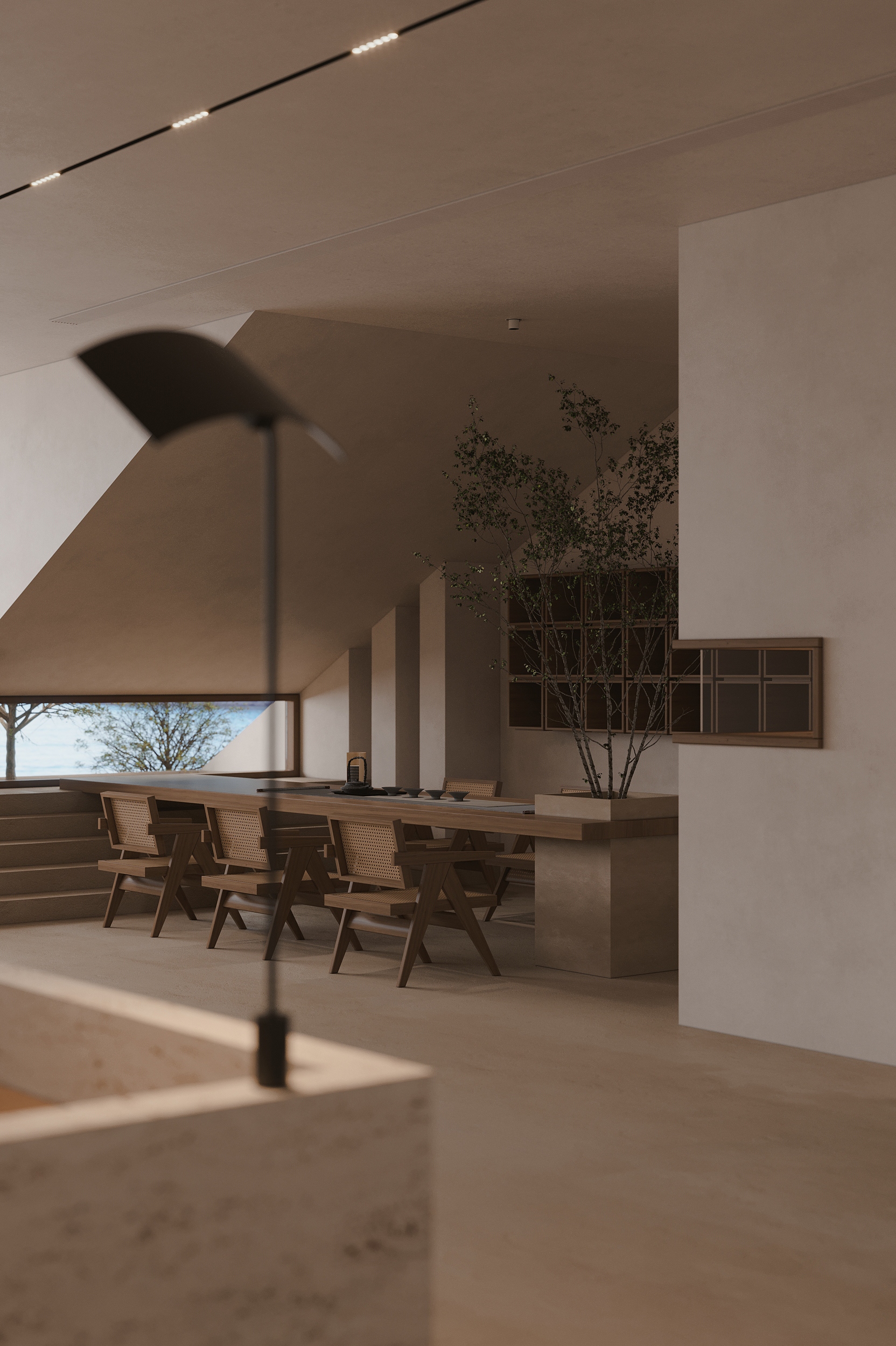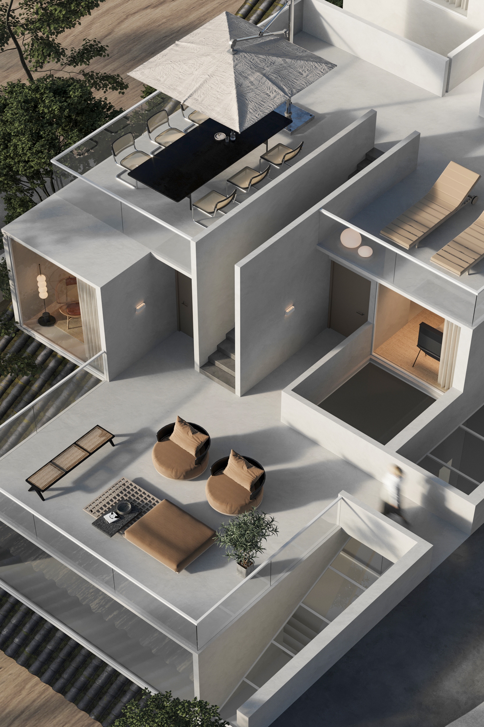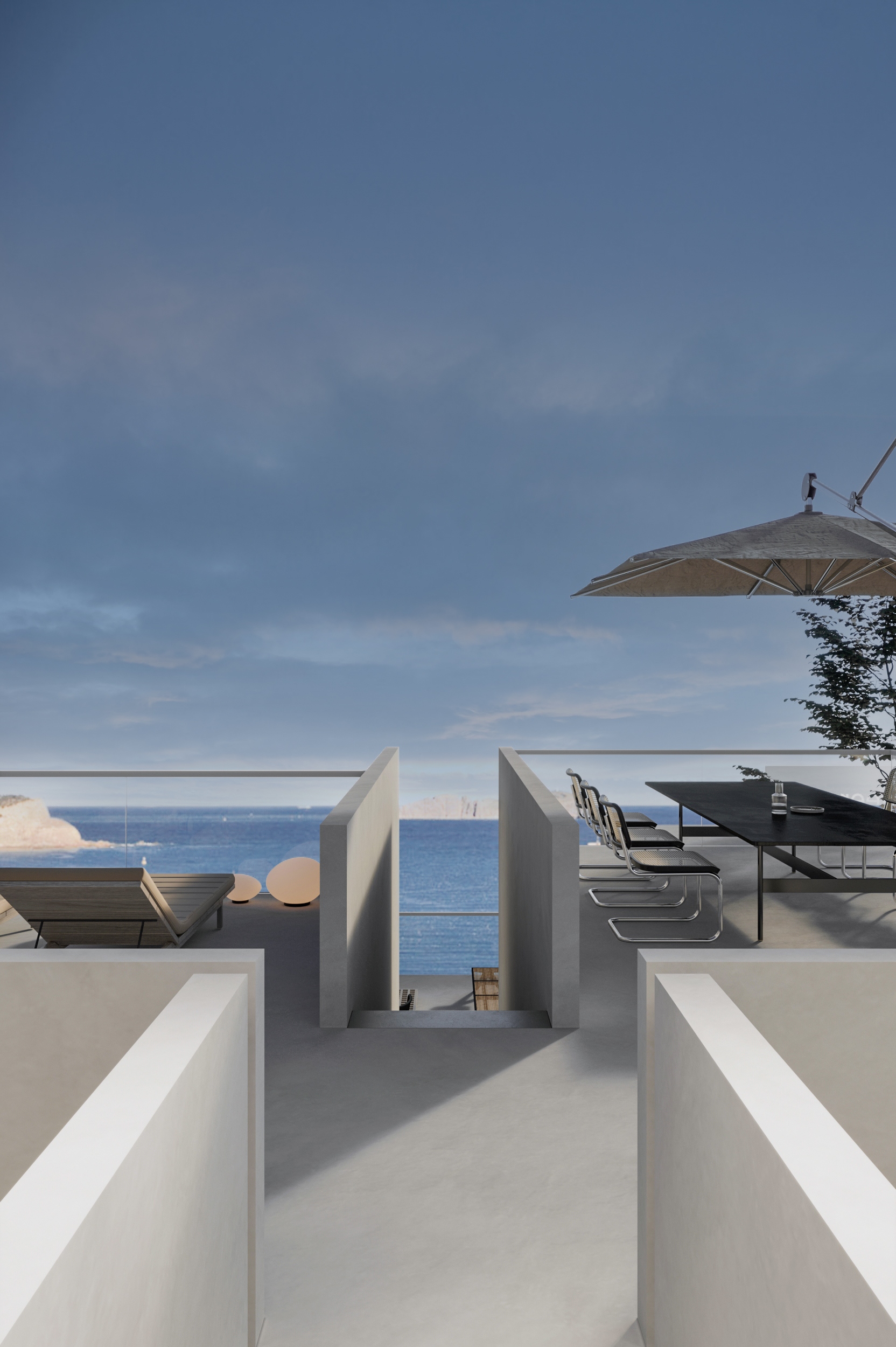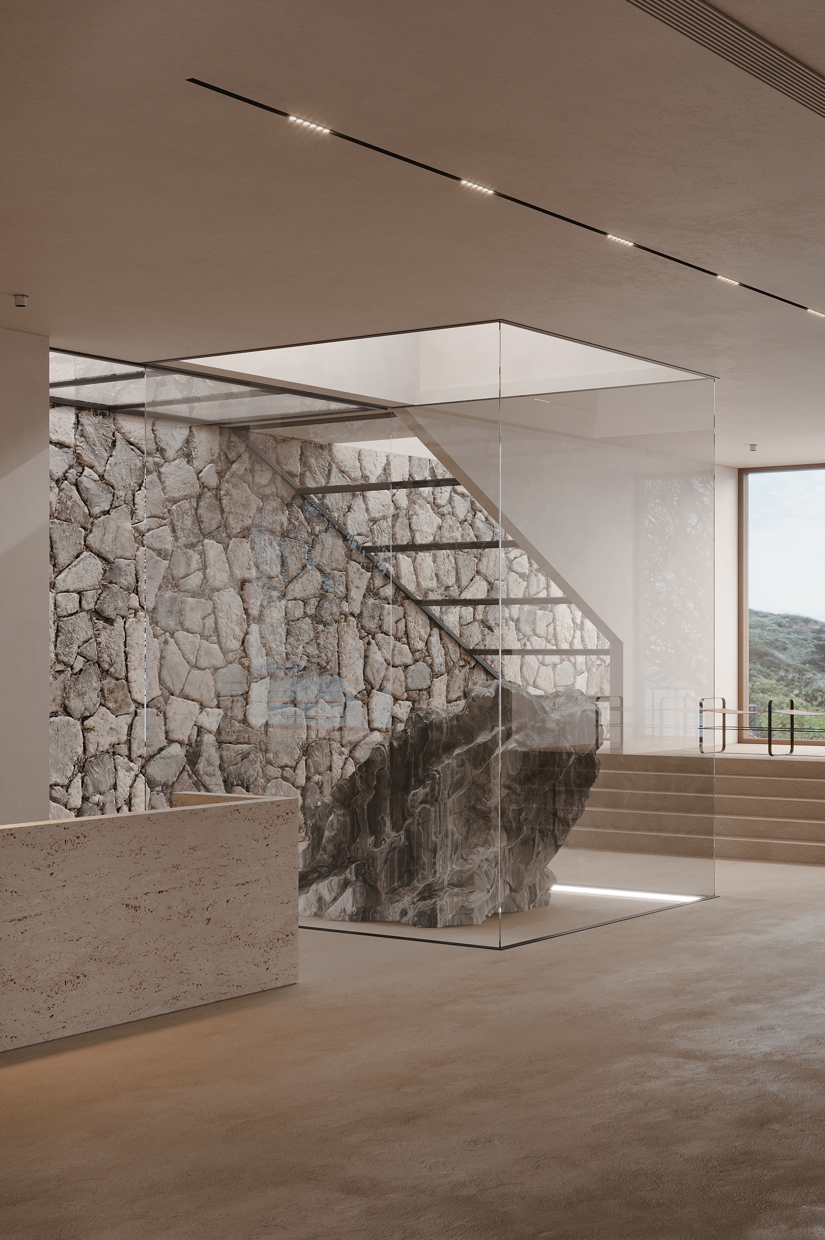 “向海而生”,是嵊泗岛民千年血脉里的生存智慧,亦是本项目临海而立的灵魂宣言。面对依山就势、错落有致的原有建筑群与壮阔海景间的天然高差,我们以“顺势”为设计圭臬。改造并非强加,而是精心梳理,让建筑群如浪涌般自然转向,迎向海洋的怀抱,为民宿集群编织出无遮挡的极致观景视野。这不仅是对海岛人文脉络的虔诚致敬,更是对项目未来商业价值的深度唤醒。 设计谦逊地顺应着村庄的原始肌理,以灵动的楼梯与错落的平台为纽带,巧妙弥合建筑间的高低落差。建筑体量回应着海风的流向,斜面舒展,其间穿插着方正的体块,犹如精心构图的取景框,将瞬息万变的海天盛景永恒地“借”入室内。纵向凿开的天井,引天光倾泻而下,为空间注入随时间流转的生命力。 材质的语言诉说着土地的深情。粗犷而原始的礁石元素被大胆引入室内,成为空间视觉的锚点与精神图腾,瞬间将海岛文化的浑厚力量凝练于一方质朴静谧之中。石与木,这些根植于本土的天然材料,是设计师对地域属性的无声礼赞,更承载着守护脆弱海岛生态的切实责任。大面积留白的运用,摒弃了冗余的矫饰,空间回归本真,气韵天然。它安静地伫立,等待时光这位最伟大的艺术家,为其表面慢慢镀上独一无二的质感与故事。