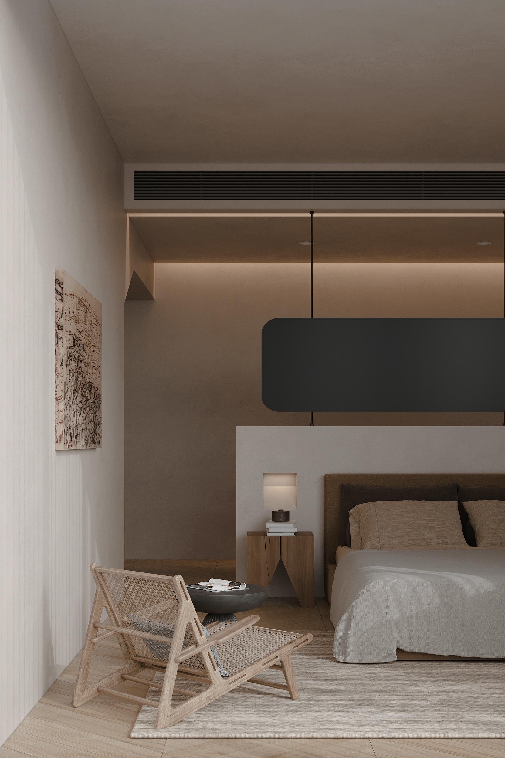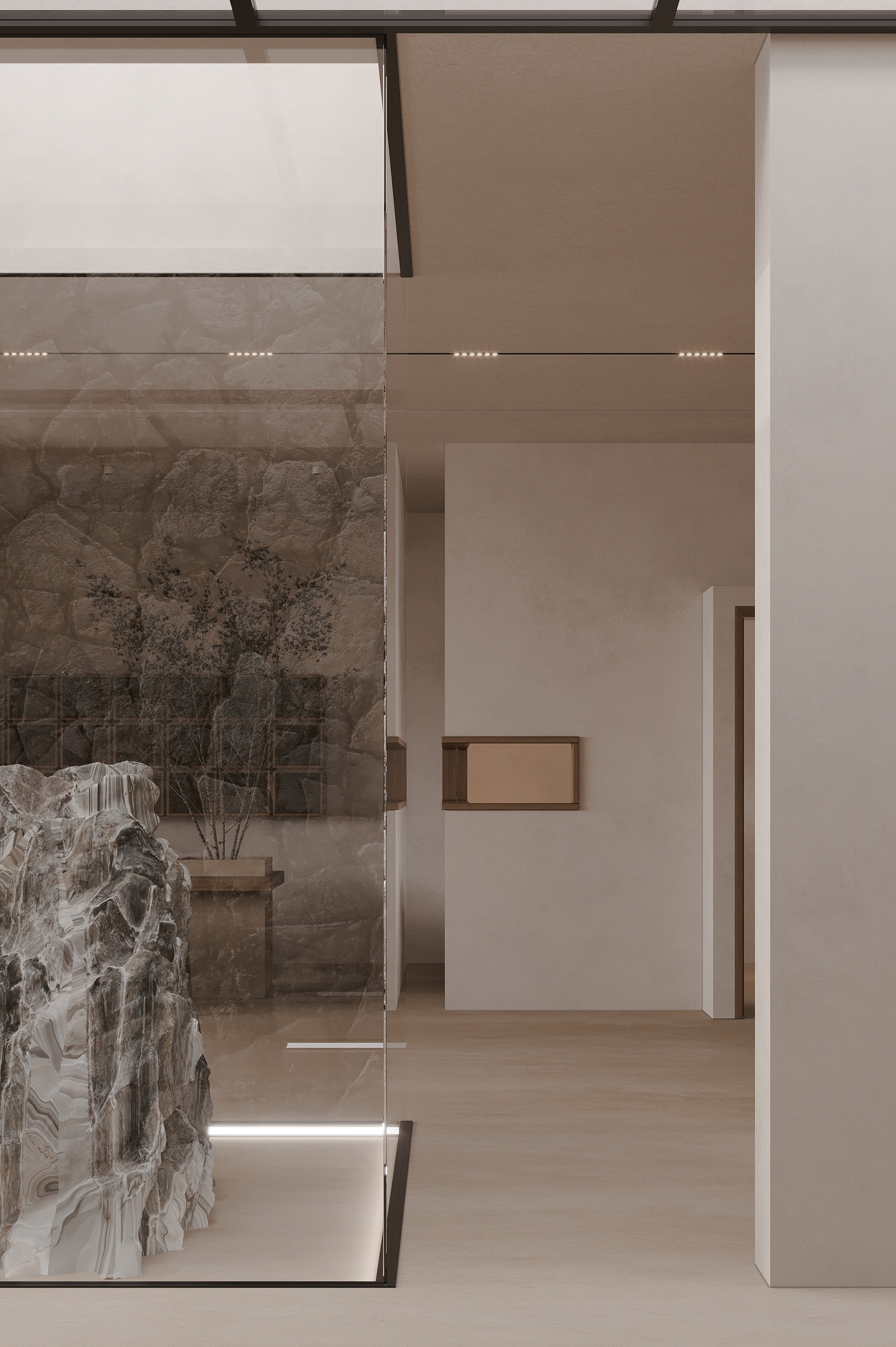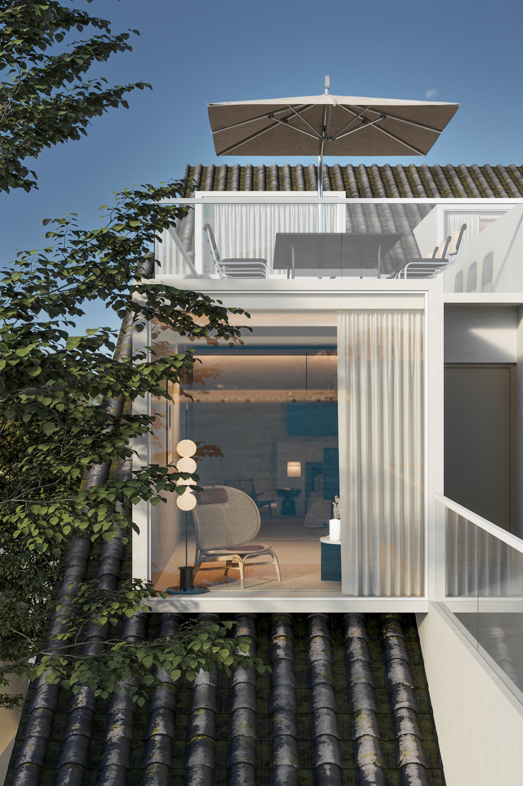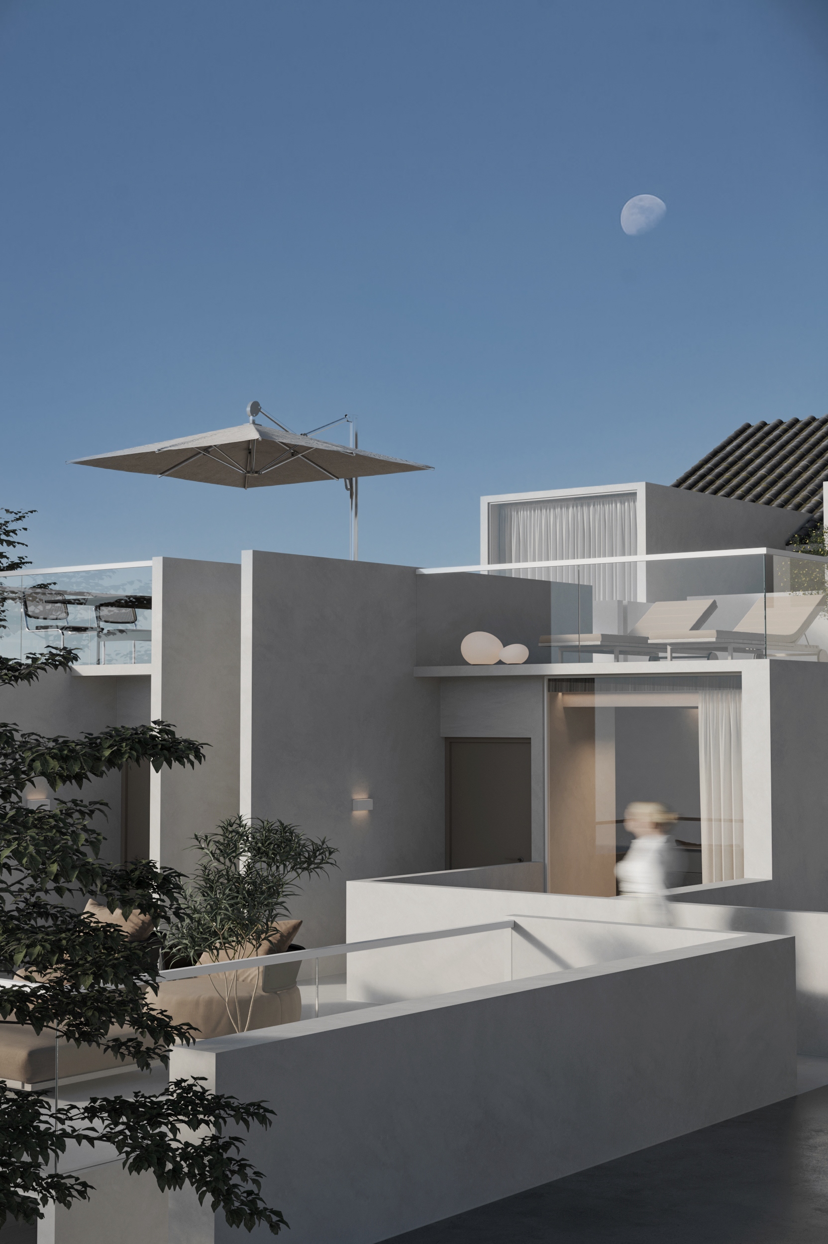 “向海而生”,是嵊泗岛民千年血脉里的生存智慧,亦是本项目临海而立的灵魂宣言。面对依山就势、错落有致的原有建筑群与壮阔海景间的天然高差,我们以“顺势”为设计圭臬。改造并非强加,而是精心梳理,让建筑群如浪涌般自然转向,迎向海洋的怀抱,为民宿集群编织出无遮挡的极致观景视野。这不仅是对海岛人文脉络的虔诚致敬,更是对项目未来商业价值的深度唤醒。 设计谦逊地顺应着村庄的原始肌理,以灵动的楼梯与错落的平台为纽带,巧妙弥合建筑间的高低落差。建筑体量回应着海风的流向,斜面舒展,其间穿插着方正的体块,犹如精心构图的取景框,将瞬息万变的海天盛景永恒地“借”入室内。纵向凿开的天井,引天光倾泻而下,为空间注入随时间流转的生命力。 材质的语言诉说着土地的深情。粗犷而原始的礁石元素被大胆引入室内,成为空间视觉的锚点与精神图腾,瞬间将海岛文化的浑厚力量凝练于一方质朴静谧之中。石与木,这些根植于本土的天然材料,是设计师对地域属性的无声礼赞,更承载着守护脆弱海岛生态的切实责任。大面积留白的运用,摒弃了冗余的矫饰,空间回归本真,气韵天然。它安静地伫立,等待时光这位最伟大的艺术家,为其表面慢慢镀上独一无二的质感与故事。