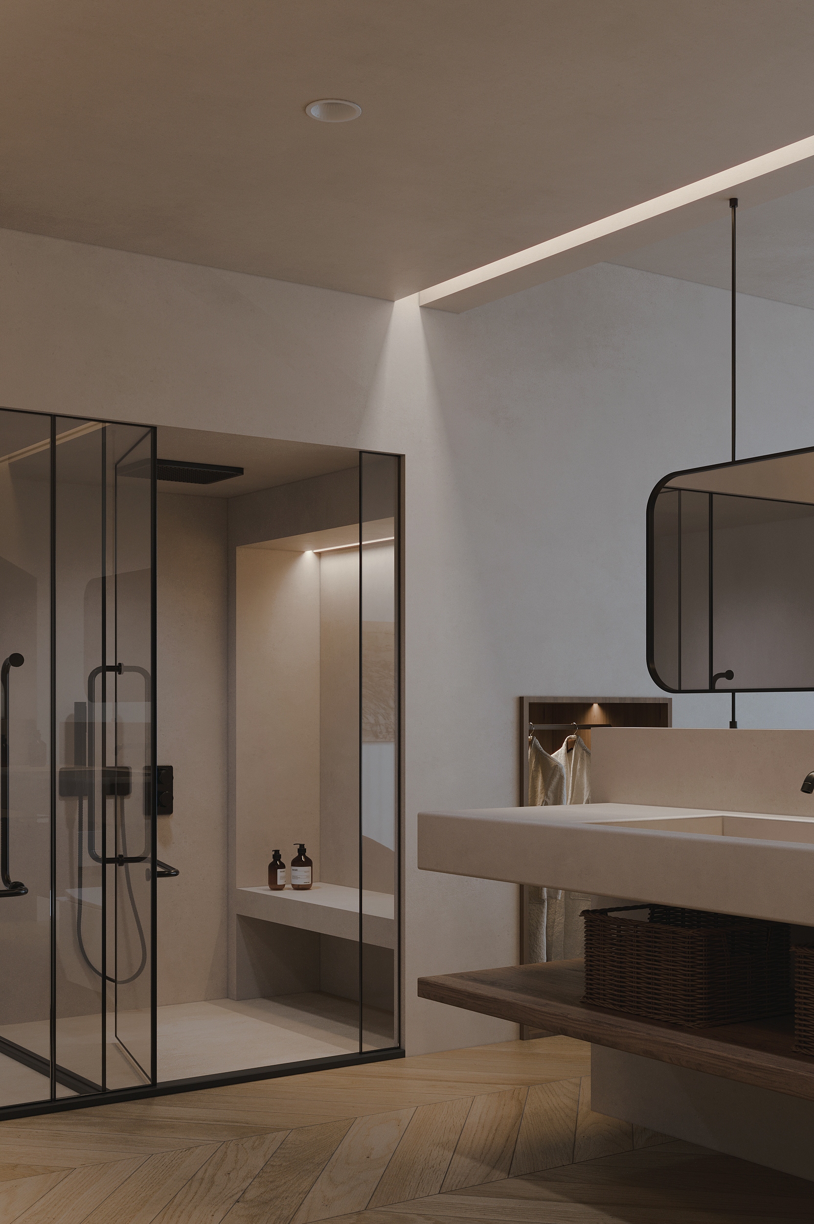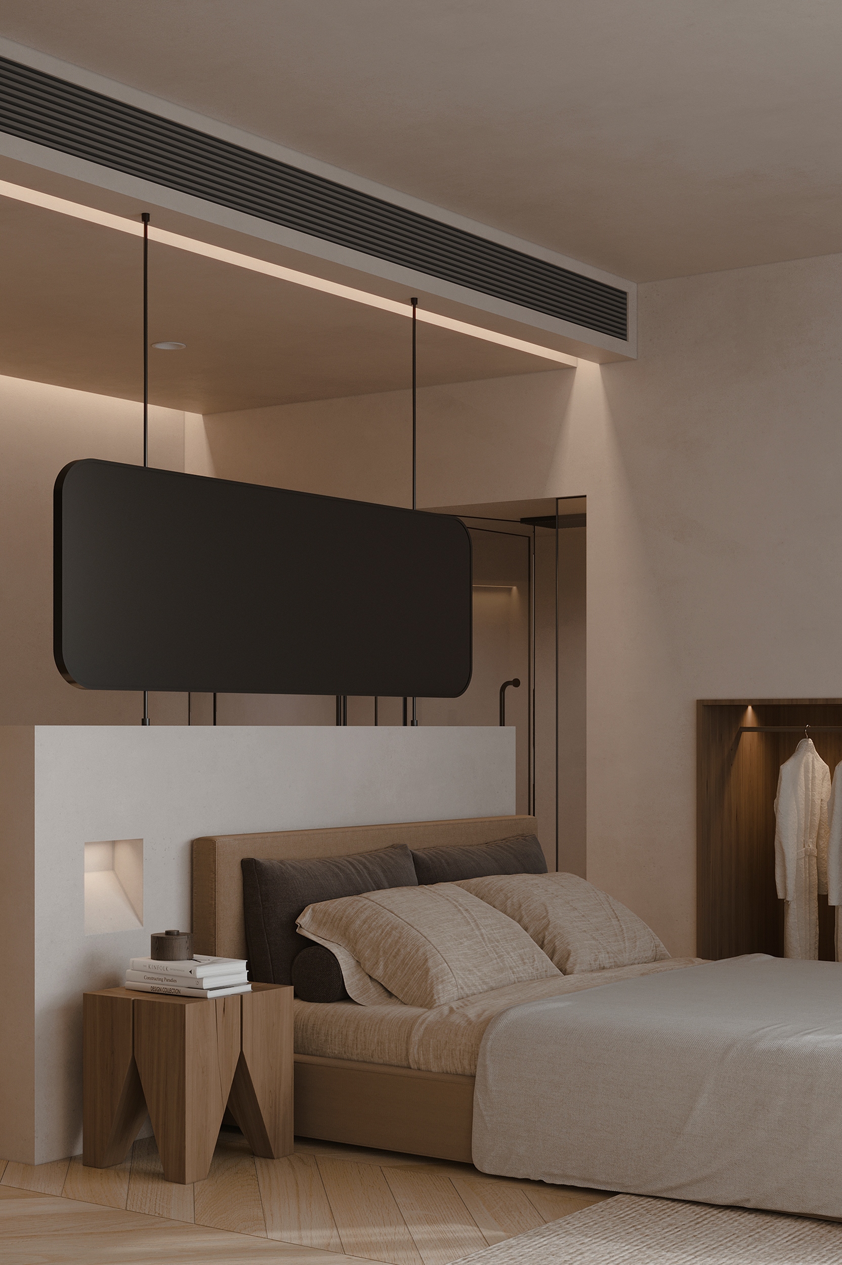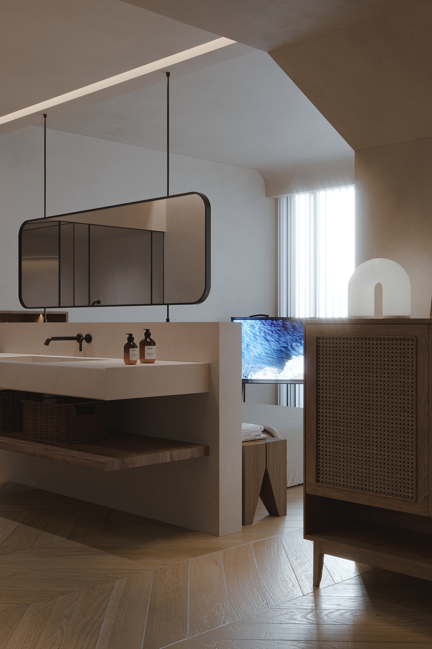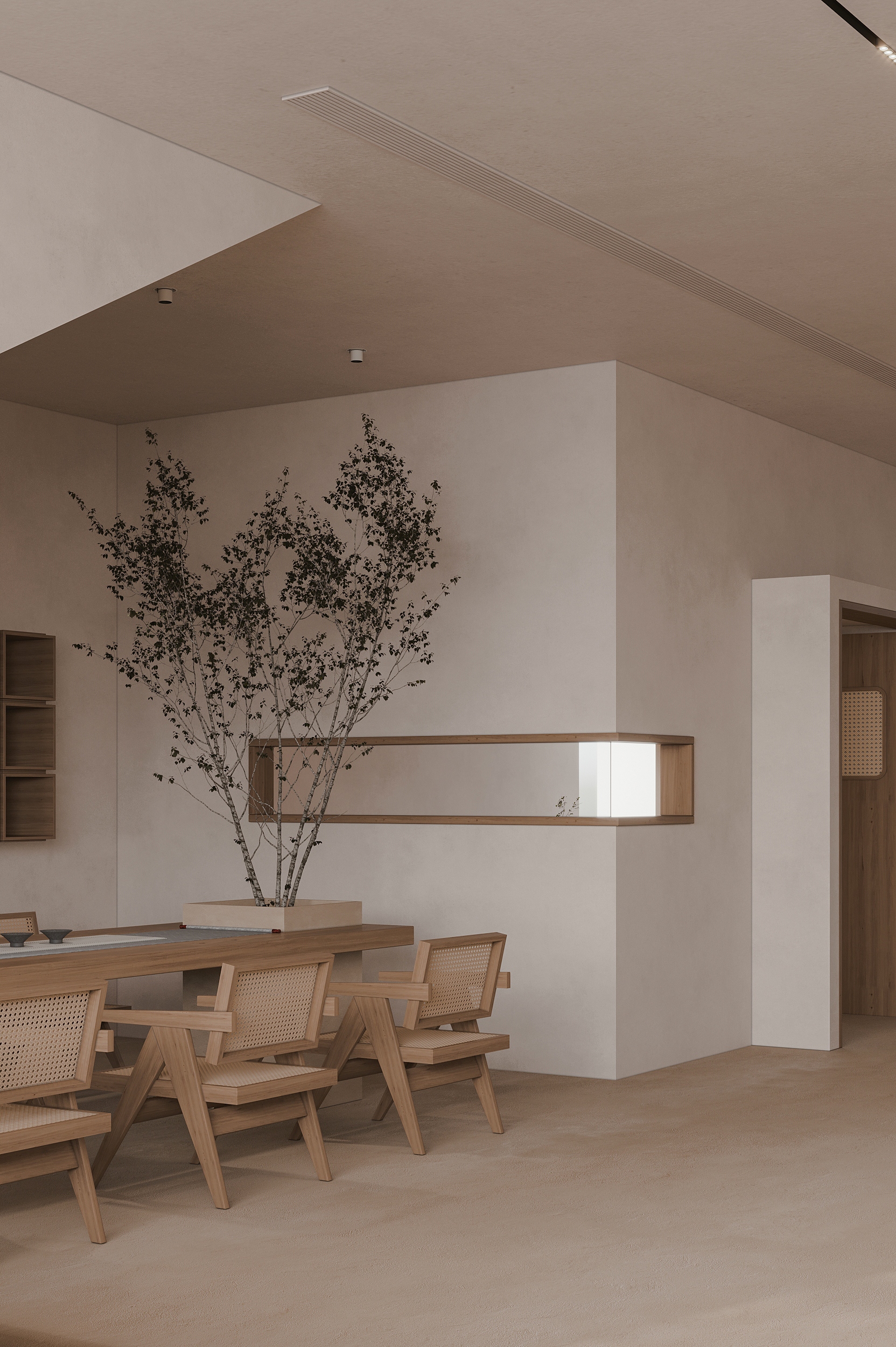“向海而生”,是嵊泗岛民千年血脉里的生存智慧,亦是本项目临海而立的灵魂宣言。面对依山就势、错落有致的原有建筑群与壮阔海景间的天然高差,我们以“顺势”为设计圭臬。改造并非强加,而是精心梳理,让建筑群如浪涌般自然转向,迎向海洋的怀抱,为民宿集群编织出无遮挡的极致观景视野。这不仅是对海岛人文脉络的虔诚致敬,更是对项目未来商业价值的深度唤醒。 设计谦逊地顺应着村庄的原始肌理,以灵动的楼梯与错落的平台为纽带,巧妙弥合建筑间的高低落差。建筑体量回应着海风的流向,斜面舒展,其间穿插着方正的体块,犹如精心构图的取景框,将瞬息万变的海天盛景永恒地“借”入室内。纵向凿开的天井,引天光倾泻而下,为空间注入随时间流转的生命力。 材质的语言诉说着土地的深情。粗犷而原始的礁石元素被大胆引入室内,成为空间视觉的锚点与精神图腾,瞬间将海岛文化的浑厚力量凝练于一方质朴静谧之中。石与木,这些根植于本土的天然材料,是设计师对地域属性的无声礼赞,更承载着守护脆弱海岛生态的切实责任。大面积留白的运用,摒弃了冗余的矫饰,空间回归本真,气韵天然。它安静地伫立,等待时光这位最伟大的艺术家,为其表面慢慢镀上独一无二的质感与故事。
