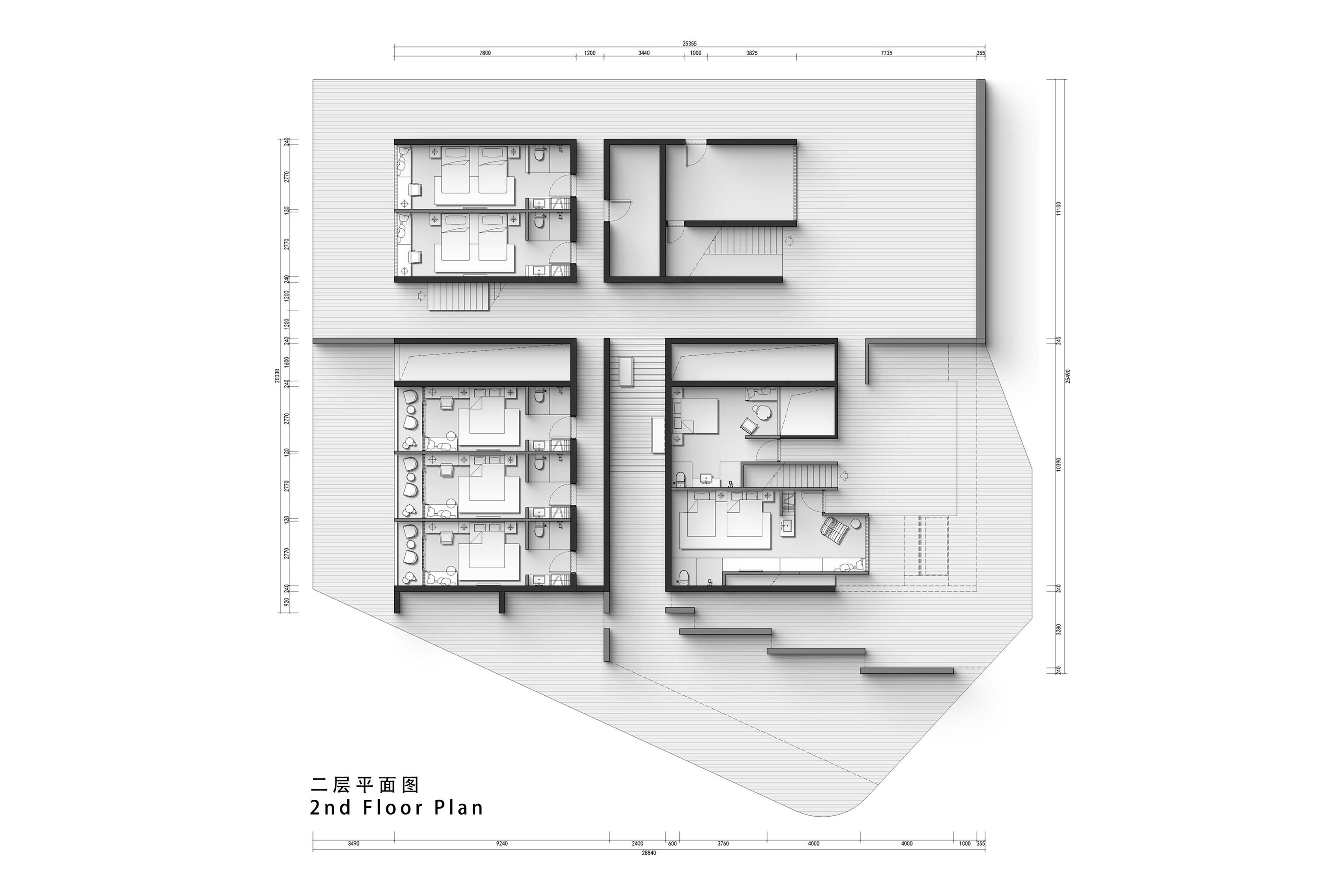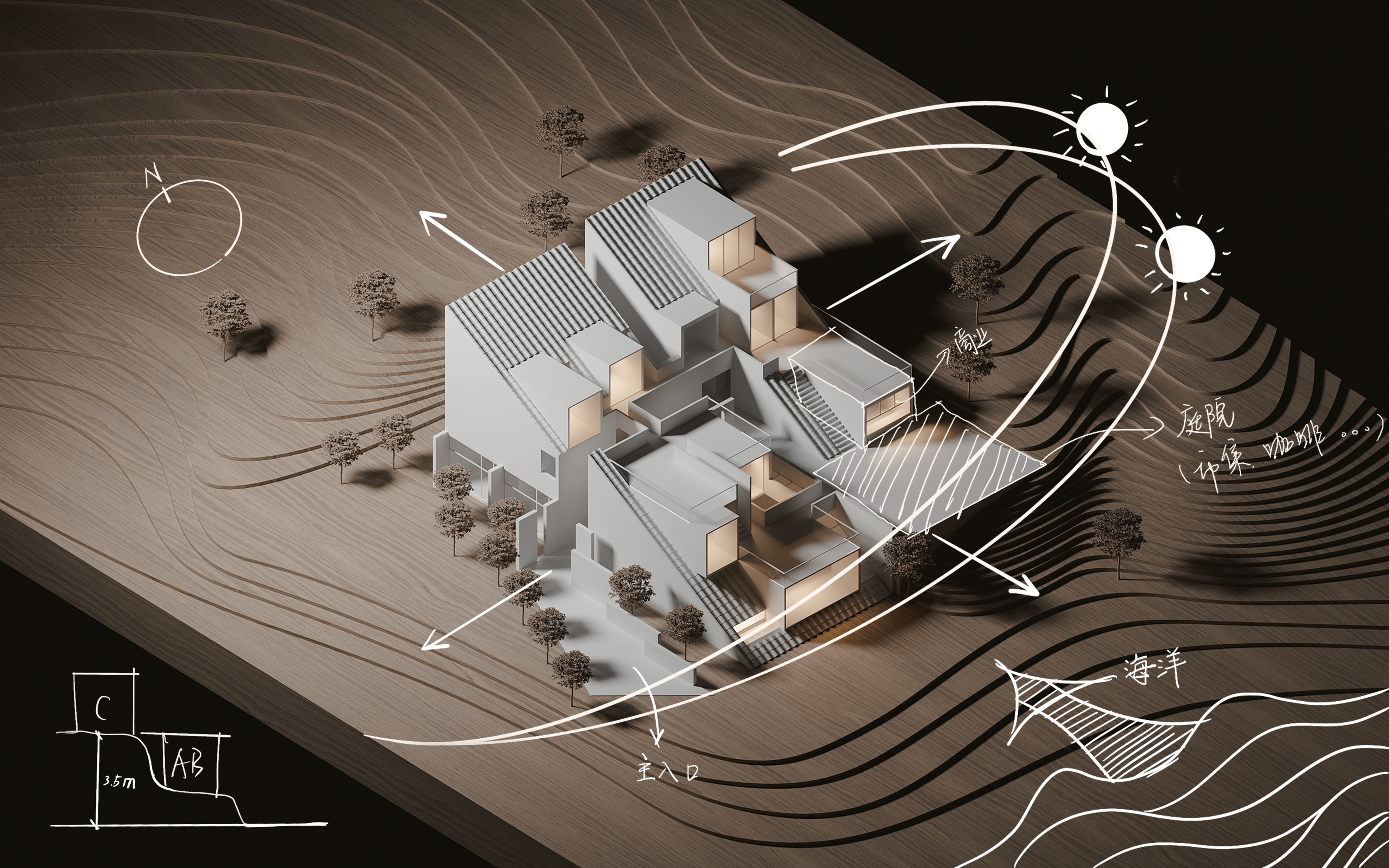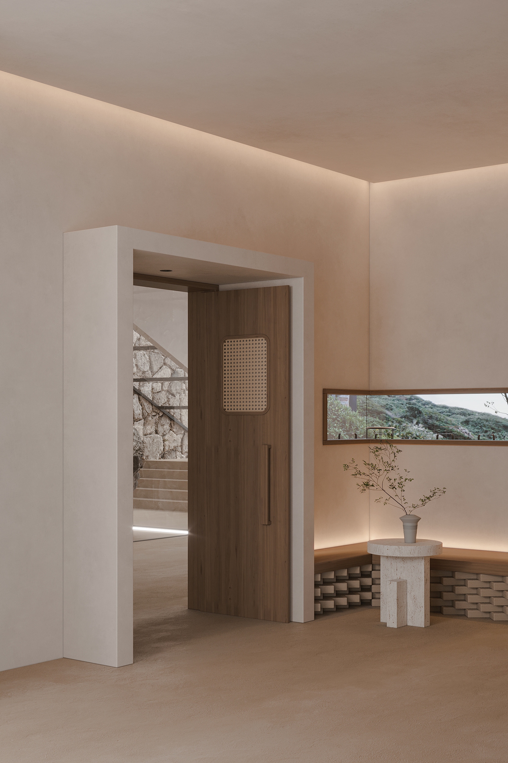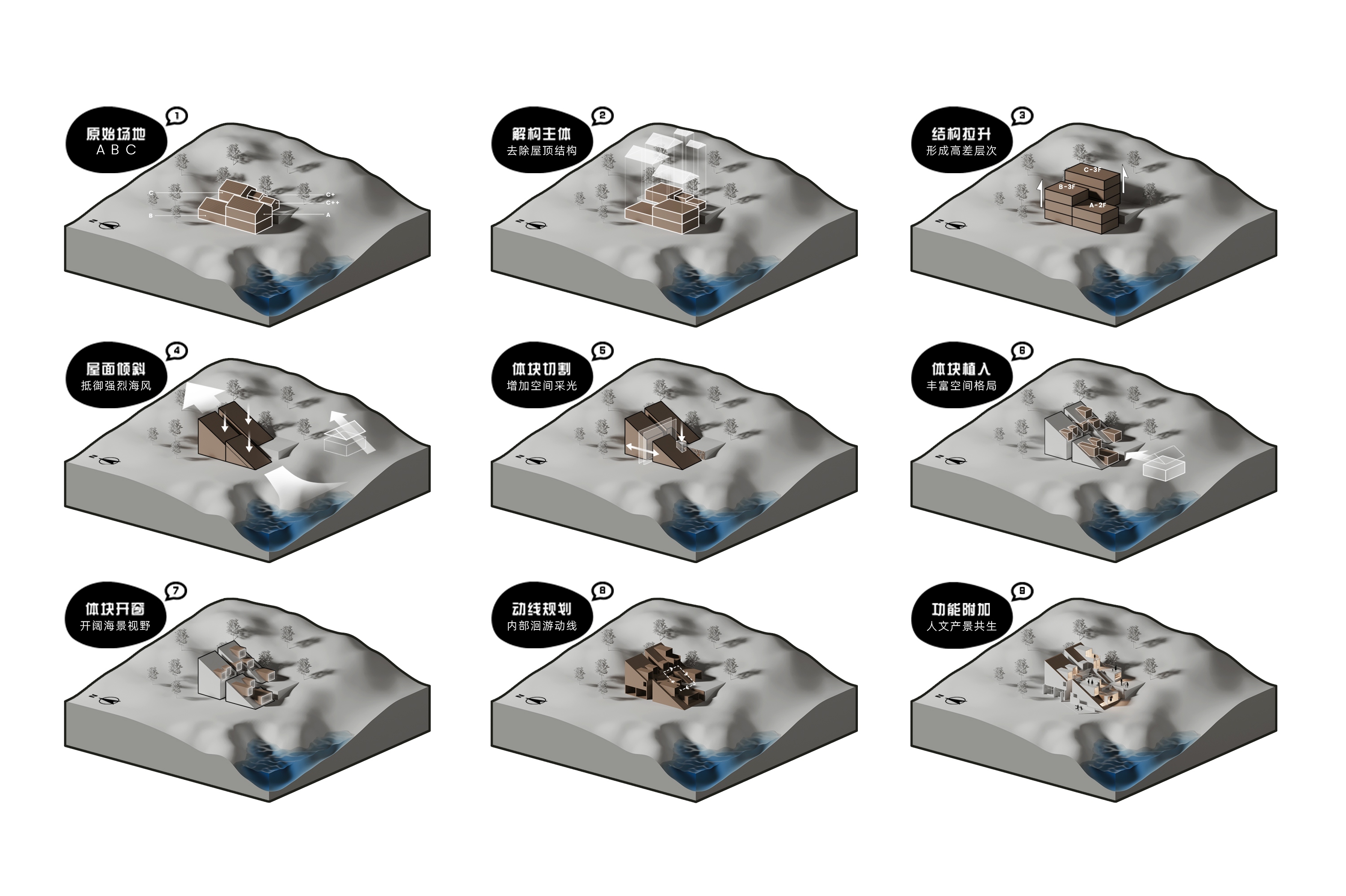"Living with the Sea" is the survival wisdom ingrained in the islanders of Shengsi for millennia, and it is also the soulful declaration of this ocean-facing project. Confronted with the natural elevation difference between the original buildings, which follow the mountainous terrain and are arranged in picturesque disorder, and the majestic sea views, we adopted "following the natural order" as our design principle. The transformation is not an imposition but a meticulous reorganization, allowing the buildings to naturally turn like waves, embracing the ocean, and weaving an unobstructed, ultimate viewing perspective for the homestay cluster. This is not only a reverent tribute to the cultural context of the island but also a profound awakening of the project's future commercial value. The design humbly conforms to the village's original fabric, using dynamic stairways and multi-level platforms as connectors to skillfully bridge the height differences between the buildings. The building volumes respond to the flow of the sea breeze, with expansive sloped surfaces interspersed with cubic forms, like carefully composed viewframes that eternally "borrow" the ever-changing sea and sky scenery into the interior. Vertically carved lightwells allow sunlight to pour in, infusing the space with a vitality that evolves with time. The language of materials speaks of the land's deep affection. Rough and primal reef elements are boldly introduced into the interior, serving as visual anchors and spiritual totems, instantly condensing the profound strength of island culture into a realm of simplicity and tranquility. Stone and wood, these natural materials rooted in the local environment, are the designer's silent tribute to regional identity, while also embodying a practical responsibility to protect the fragile island ecosystem. The extensive use of blank space rejects redundant ornamentation, allowing the space to return to its essence with a natural aura. It stands quietly, waiting for time, the greatest artist, to slowly imbue its surfaces with unique texture and stories.