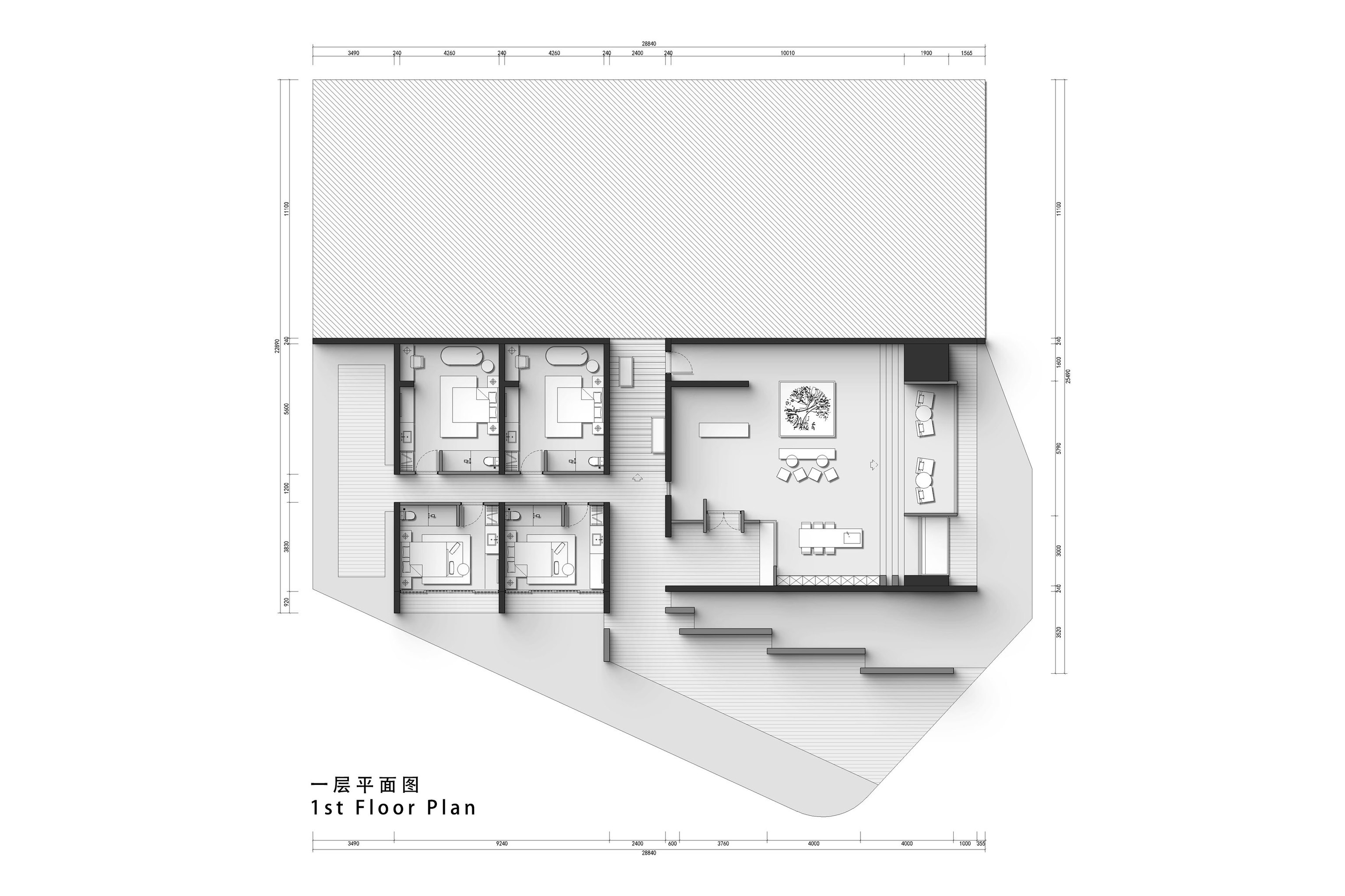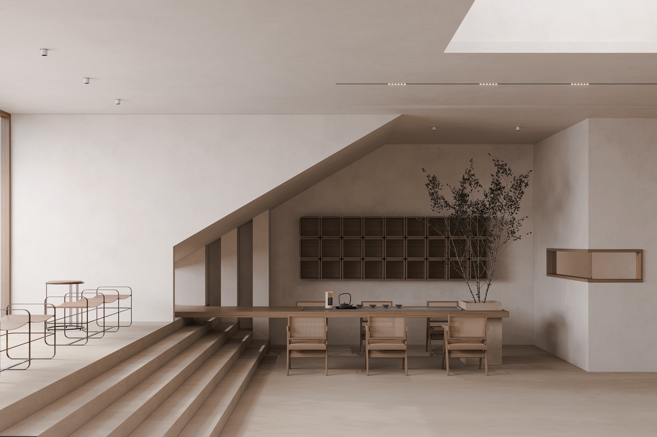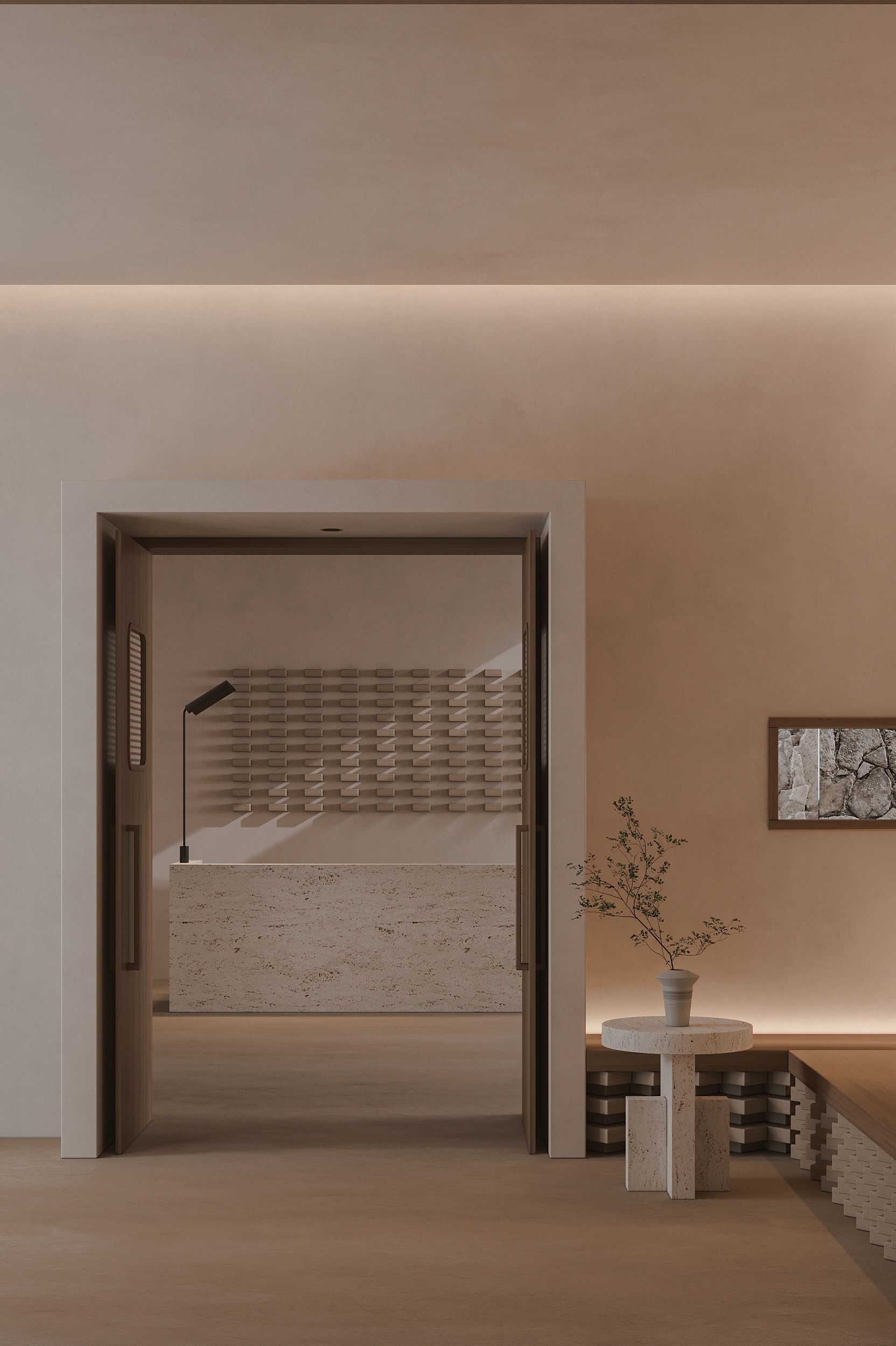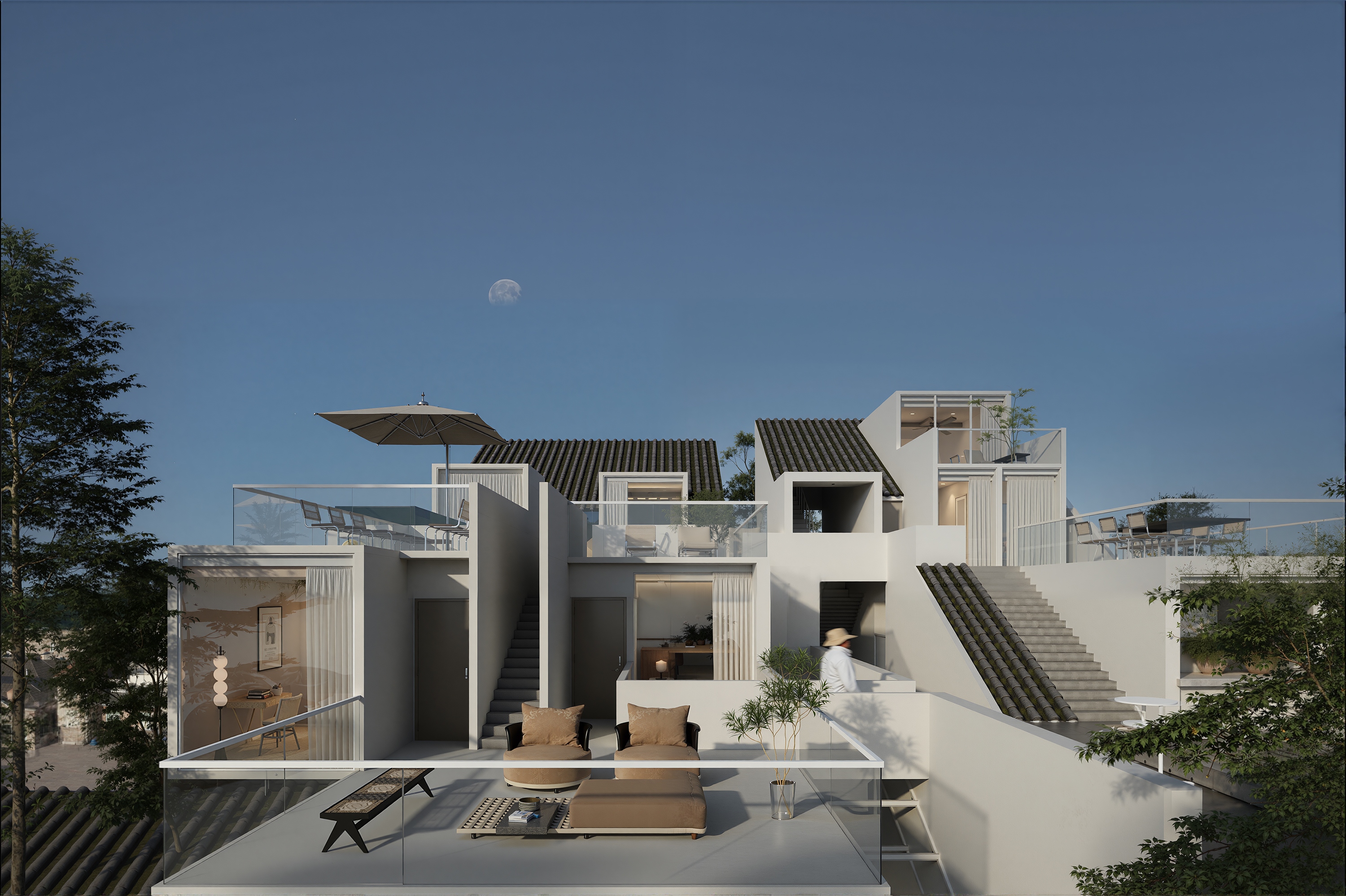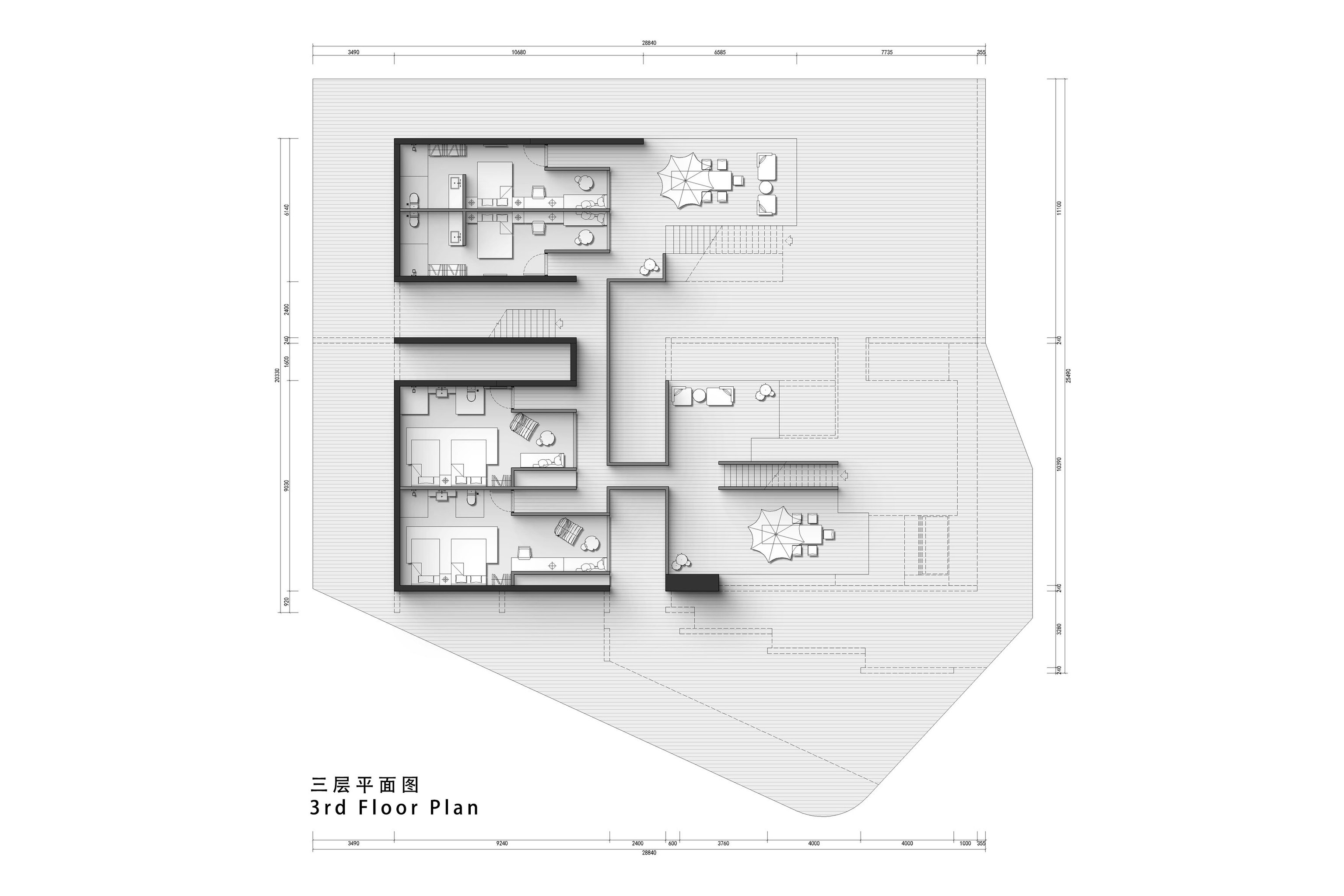 "Living with the Sea" is the survival wisdom ingrained in the islanders of Shengsi for millennia, and it is also the soulful declaration of this ocean-facing project. Confronted with the natural elevation difference between the original buildings, which follow the mountainous terrain and are arranged in picturesque disorder, and the majestic sea views, we adopted "following the natural order" as our design principle. The transformation is not an imposition but a meticulous reorganization, allowing the buildings to naturally turn like waves, embracing the ocean, and weaving an unobstructed, ultimate viewing perspective for the homestay cluster. This is not only a reverent tribute to the cultural context of the island but also a profound awakening of the project's future commercial value. The design humbly conforms to the village's original fabric, using dynamic stairways and multi-level platforms as connectors to skillfully bridge the height differences between the buildings. The building volumes respond to the flow of the sea breeze, with expansive sloped surfaces interspersed with cubic forms, like carefully composed viewframes that eternally "borrow" the ever-changing sea and sky scenery into the interior. Vertically carved lightwells allow sunlight to pour in, infusing the space with a vitality that evolves with time. The language of materials speaks of the land's deep affection. Rough and primal reef elements are boldly introduced into the interior, serving as visual anchors and spiritual totems, instantly condensing the profound strength of island culture into a realm of simplicity and tranquility. Stone and wood, these natural materials rooted in the local environment, are the designer's silent tribute to regional identity, while also embodying a practical responsibility to protect the fragile island ecosystem. The extensive use of blank space rejects redundant ornamentation, allowing the space to return to its essence with a natural aura. It stands quietly, waiting for time, the greatest artist, to slowly imbue its surfaces with unique texture and stories.